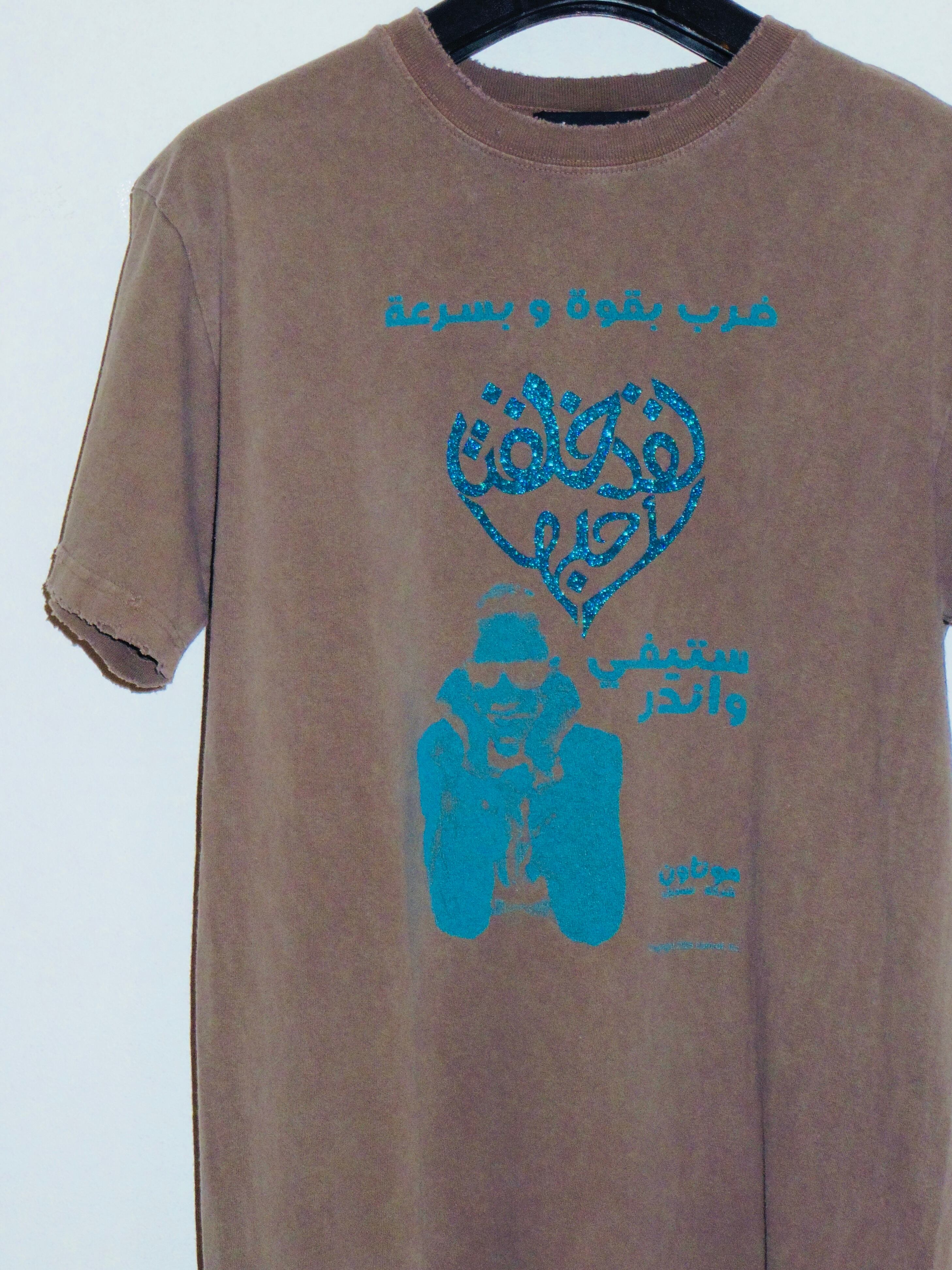 某「盲目の天才」アーティストの当時のライブフライヤーのデザインを英語表記を全てアラビア語に変更(エジプト人のグラフィックデザイナーと共作なのでアラビア語の翻訳はネイティブ、アラビア語フォントも拘って選定しています)し、ハート型のグラフィックにはラメプリントを採用。