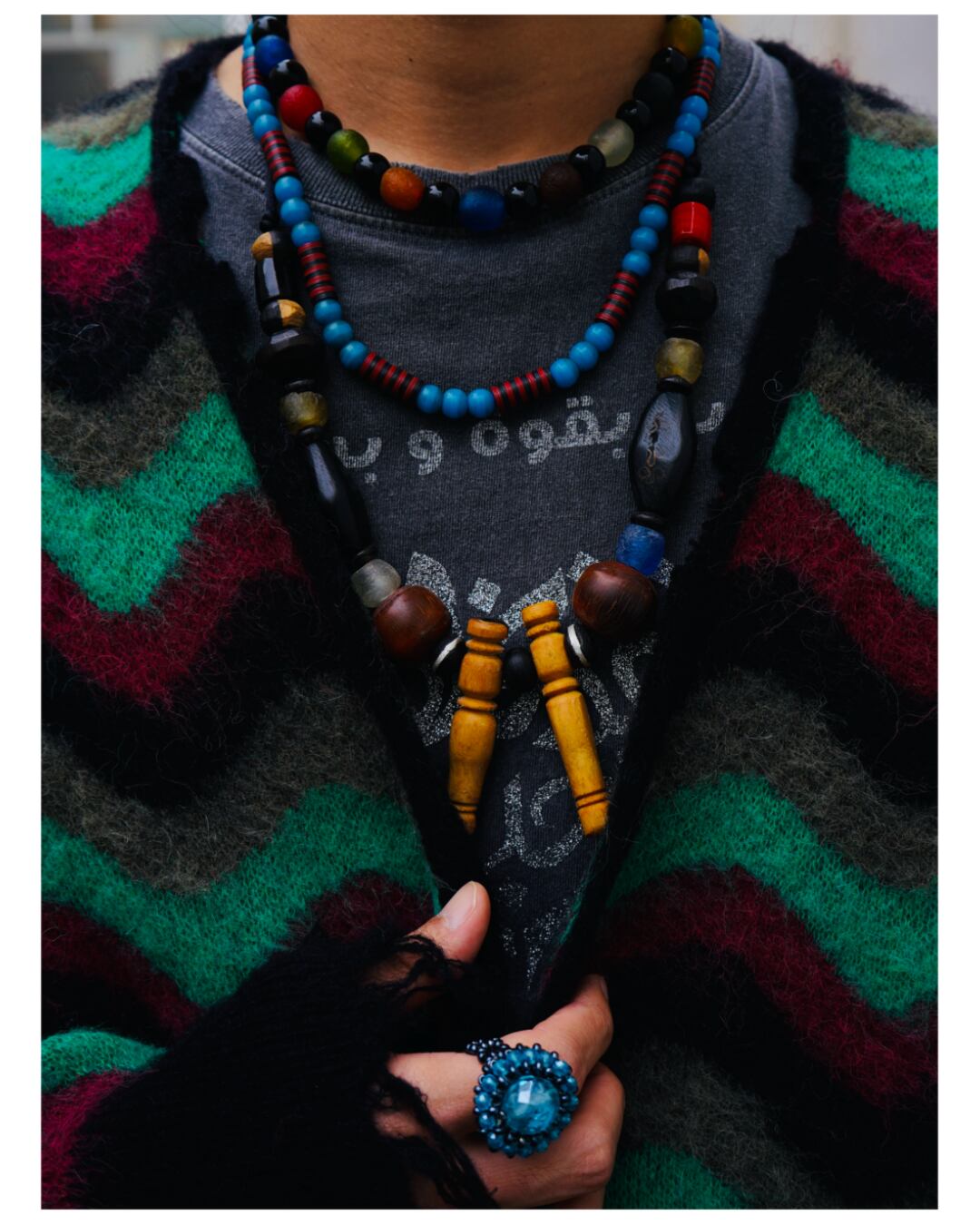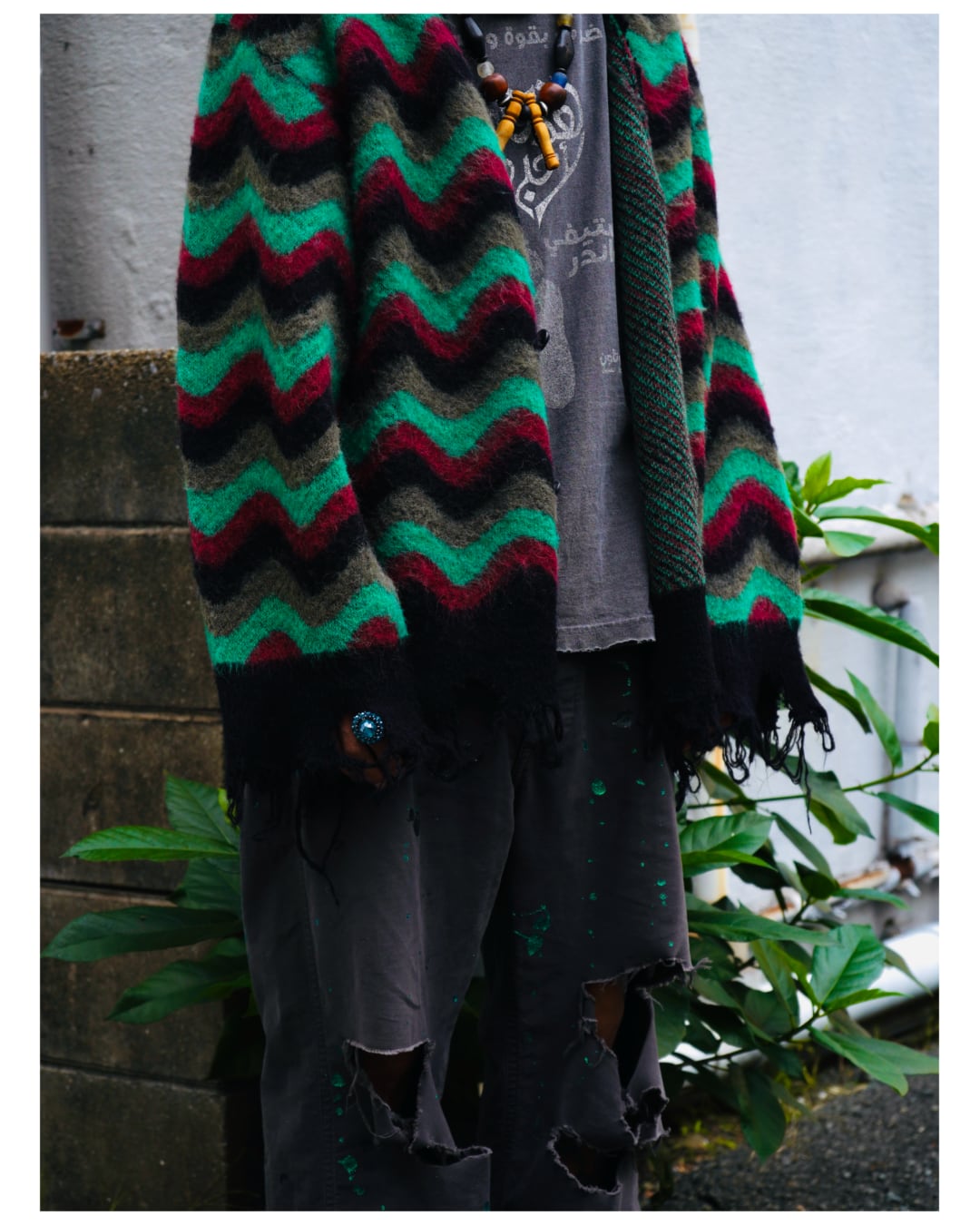 Wave Mohair Knitと同編みでカーディガンを新たに作製。波柄の特徴的な編み方で柄を表現したモヘアニット。