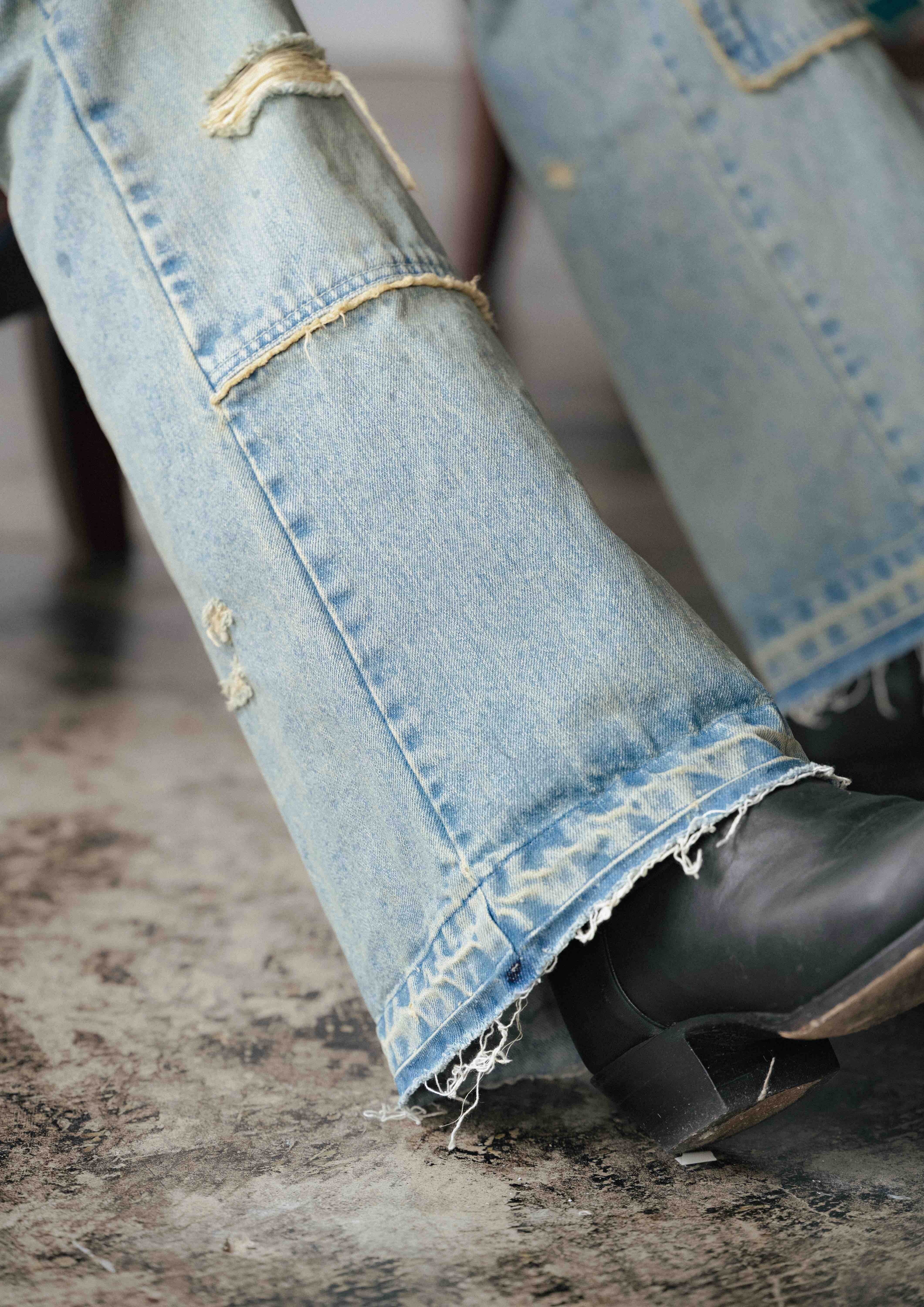 加⼯の段階で独⾃のレシピでブリーチ、ダメージ、オーバーダイ、そして1点1点職⼈さんの⼿作業により汚しを施した絶妙な塩梅の着古したデニムを表現しました。