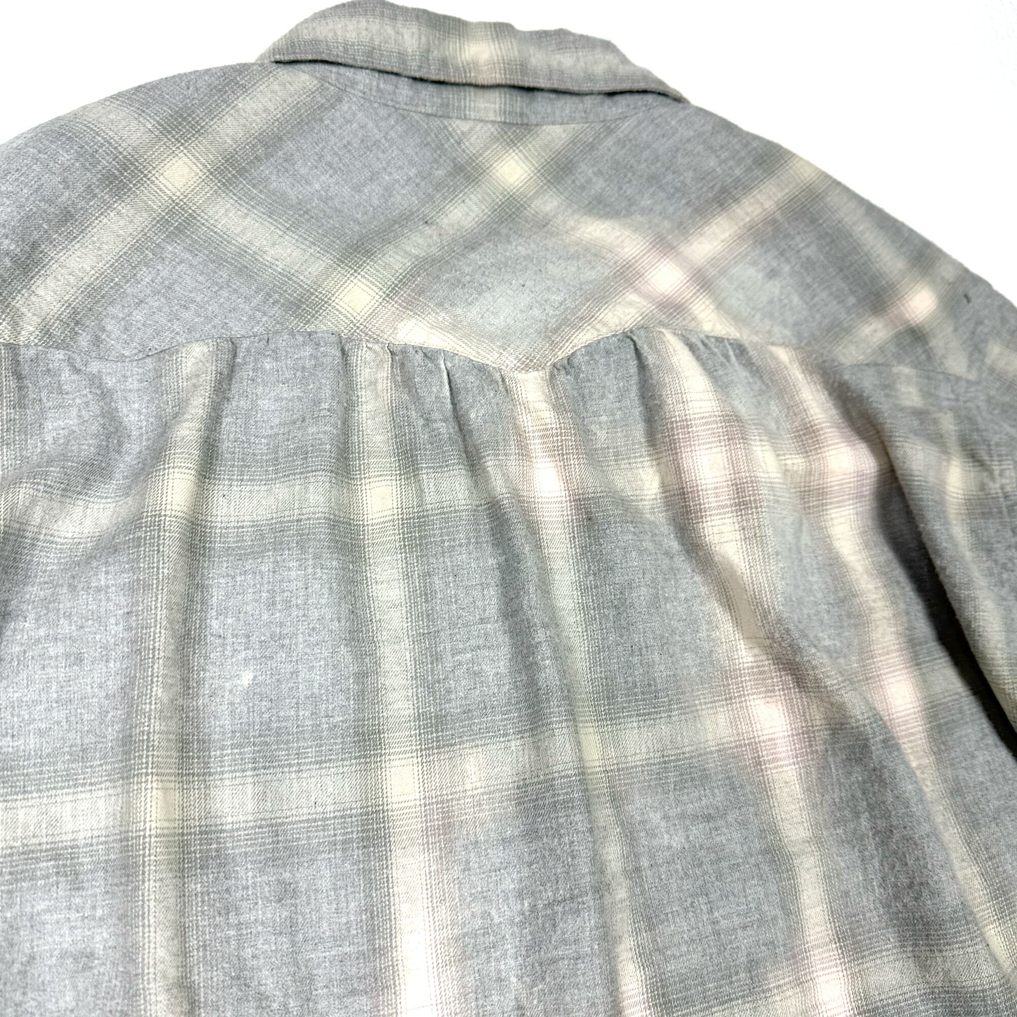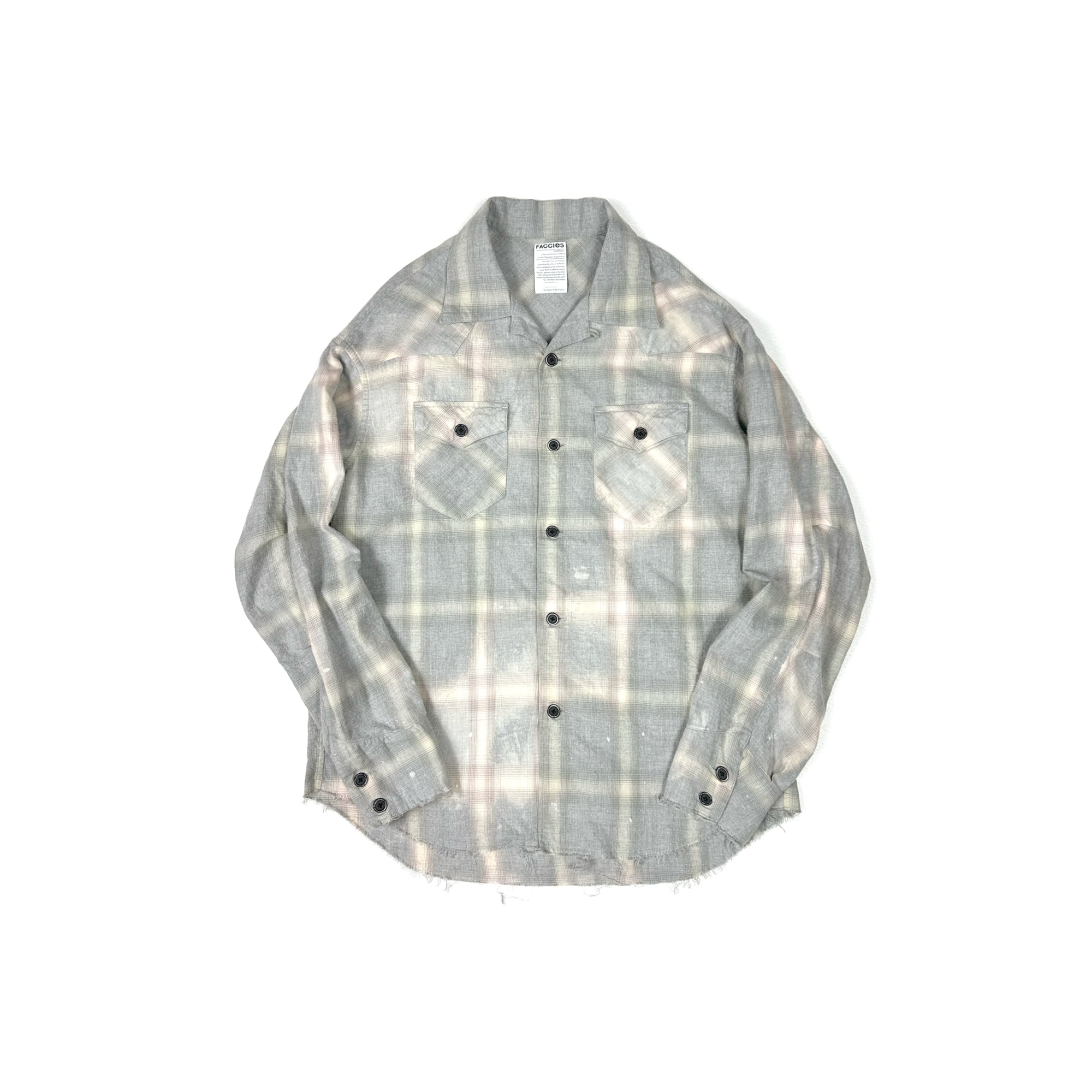 シルエットは70年代のウエスタンシャツをベースにFACCIESの視点からモダナイズ。ウエストのジボリ感など無くし袖先、裾先、など箇所箇所に断ち切りの仕様にしルーズ感を演出。後⾝のヨーク部分にはギャザーを⼊れ⽴体感を再現。
