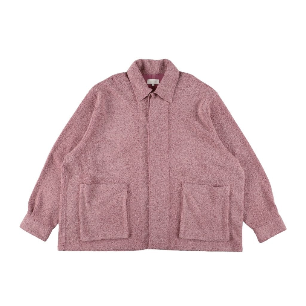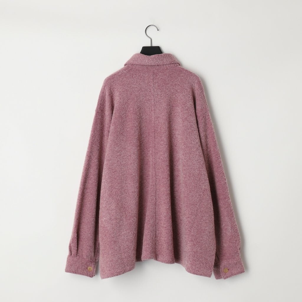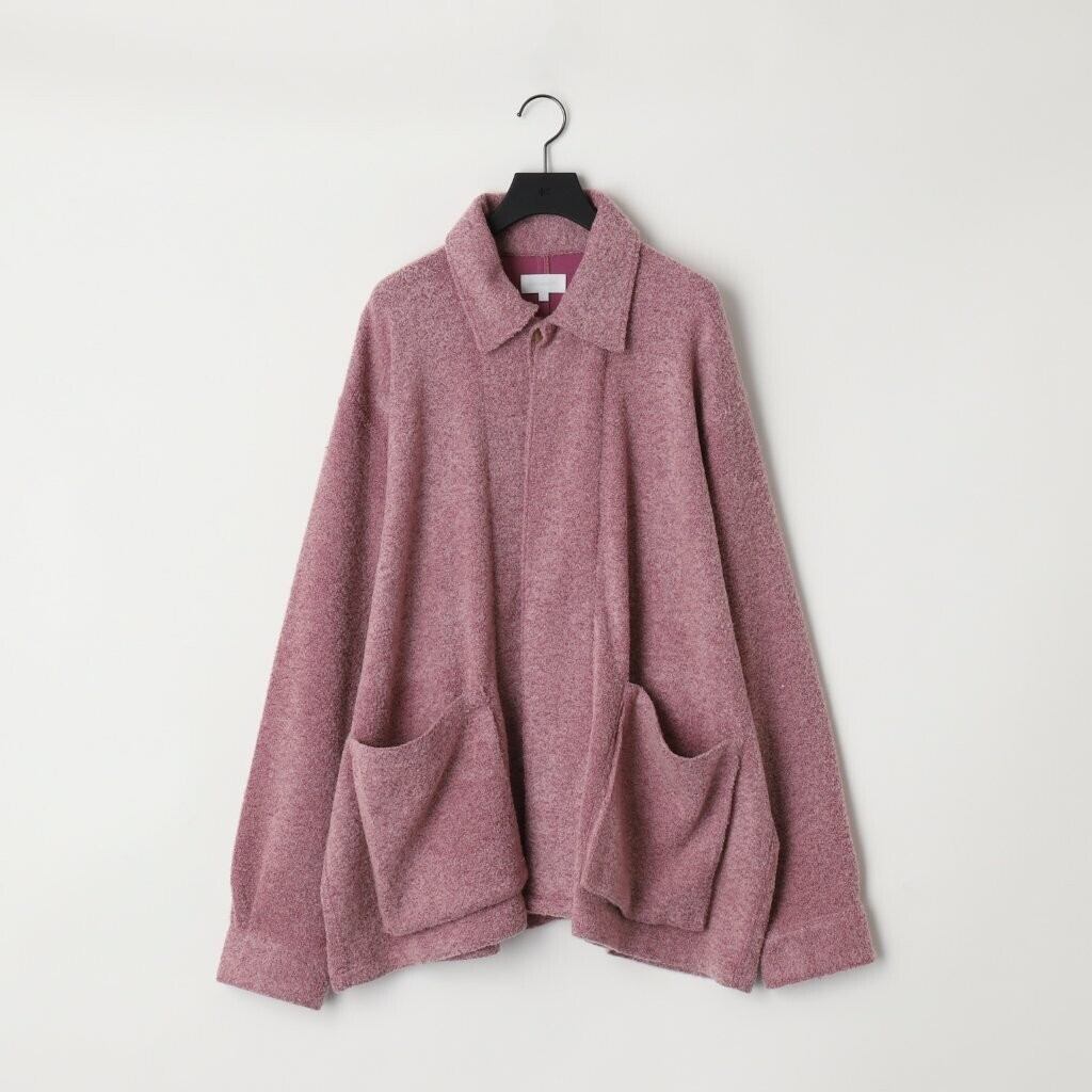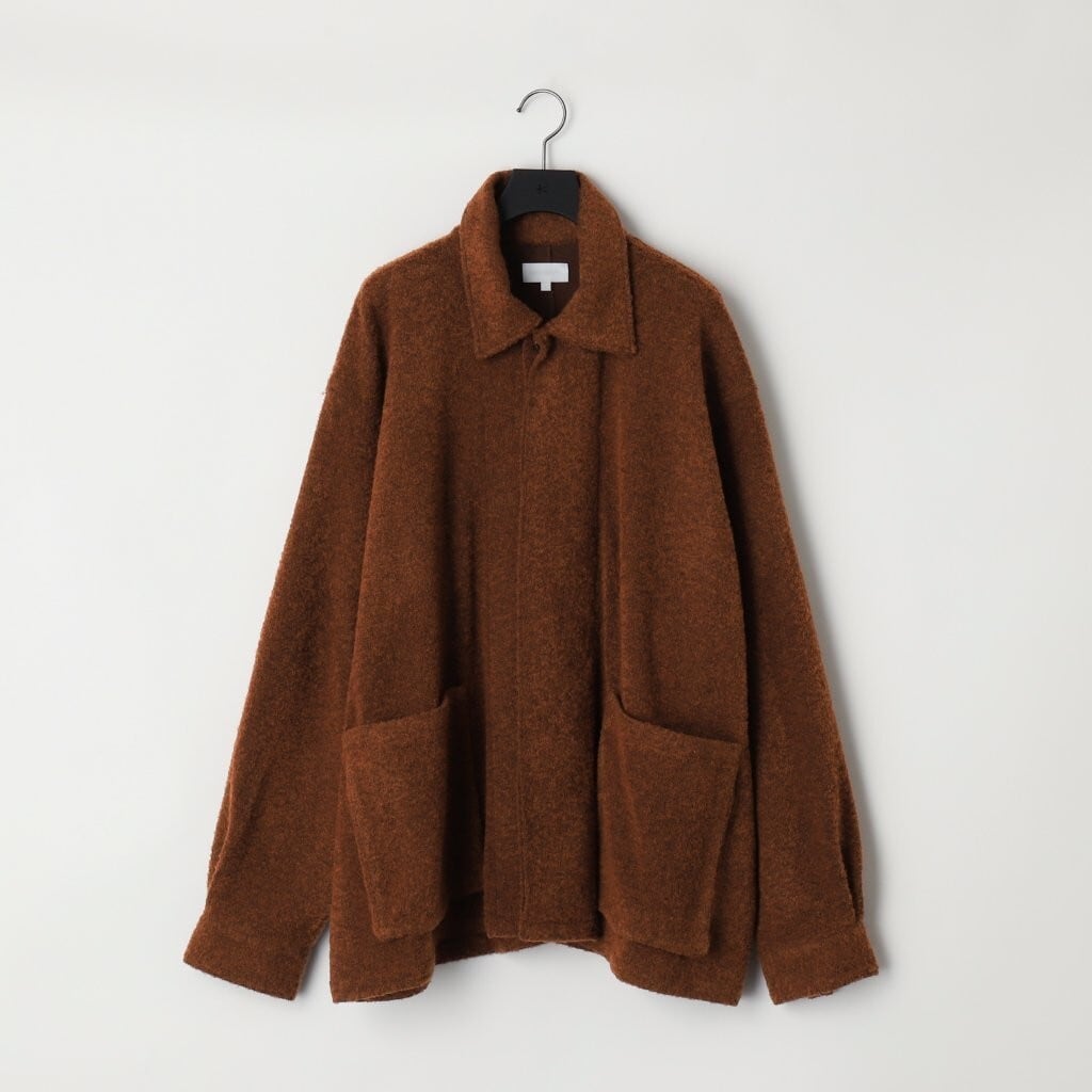 クォーターゲージと言う、特殊編み機で編み立てた新素材。表側は、7G というローゲージ、裏側は、28G というハイゲージ素材となります。ボンディングのような雰囲気もある接結素材。表側には、ウールナイロンブークレー糸で仕上げ、凹凸感のあるカジュアルな表情感。裏側には、高収縮ナイロンとなり、ハリ感とストレッチ性、滑らかな肌触りとなります。ナイロンと合わせて交編することで家庭洗濯可能な素材となっております。裏地いらずで肌さわりもよく見た目とまったく違った着心地を持つシャツとなります。程よいハリ感もあり、体に沿って膨らみ落ちるシルエットは、素材とのギャップがあり面白い雰囲気を持っております。素材の表面感を楽しんで頂く為にあえて、比翼仕立てに仕上げたモダンフィットなシャツジャケット。