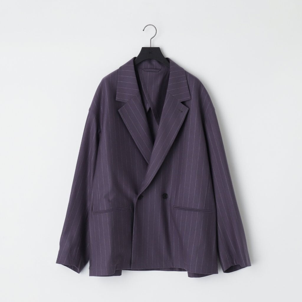る最大限の細さの糸 1/60 super120 ノンミュールジングウールを使用しています。また、生地での最終工程で縮絨加工をすることで軽く毛羽立たせ、ハイゲージメルトン生地を実現。高級感と粗々しさを持ち合わせたテキスタイルです。もちろん、ウールの機能性(保温性、抗菌性)は維持されたまま、さらりとした肌さわりとニットのストレッチ性がある今までにないウール素材。等間隔でポリエステル糸を入れて、ストライプ柄を表現。小ぶりな釦が特徴的で、素材の落ち感を活かし、開けても釦をかけても決まるように前身ごろに分量を計算して取っております。ドレスにもカジュアルにも着用頂けるバランスで仕上げております。