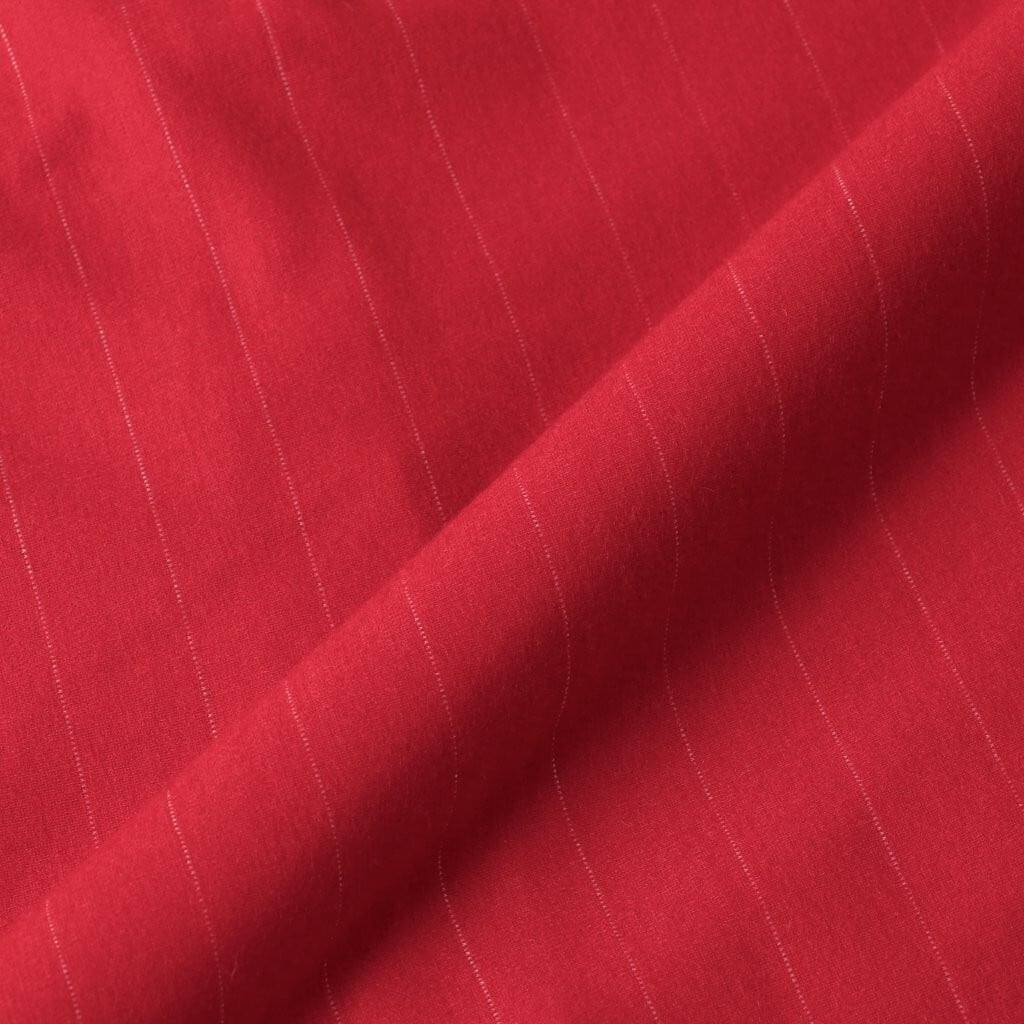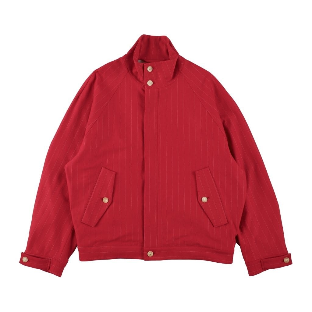 る最大限の細さの糸 1/60 super120 ノンミュールジングウールを使用しています。また、生地での最終工程で縮絨加工をすることで軽く毛羽立たせ、ハイゲージメルトン生地を実現。高級感と粗々しさを持ち合わせたテキスタイルです。もちろん、ウールの機能性(保温性、抗菌性)は維持されたまま、さらりとした肌さわりとニットのストレッチ性がある今までにないウール素材。等間隔でポリエステル糸を入れて、ストライプ柄を表現。もちろん家庭洗濯可能です。洗いを繰り返すことでよる風合いが増していき、育てていくことができる素材。ラグラン仕様で巾をしっかりとったブルゾン。秋口は、アウター真冬はライトアウターとしても着用頂ける 1 着。襟を立てても畳んでもちょうどよいバランスで首元を作成しました。