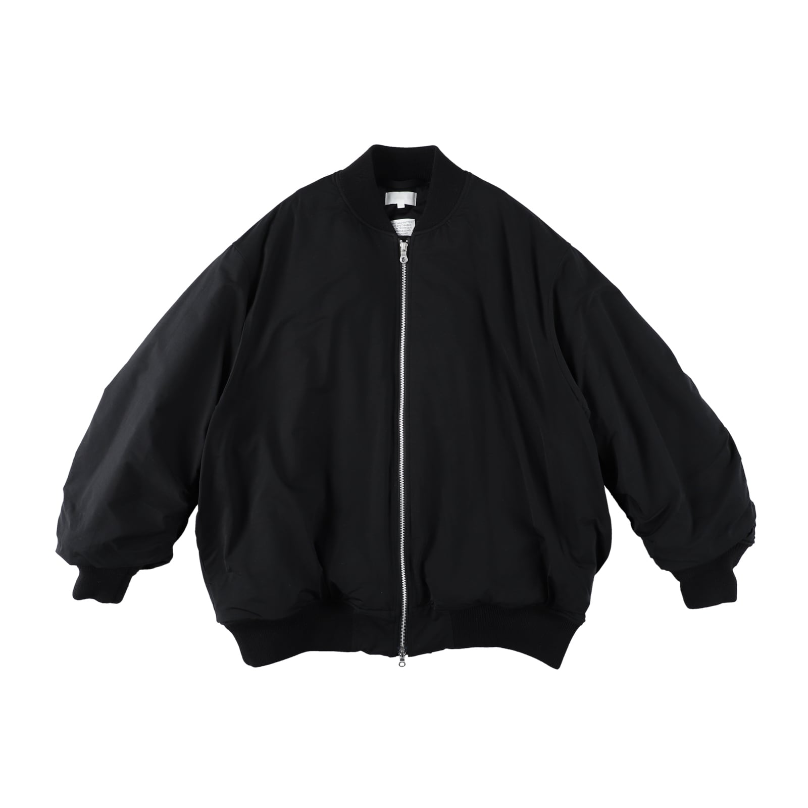 た我々にしかできないニュースタンダード素材。今シーズンからは、綿糸の原料を変え、160/2 という細番手双糸使いにアップデート。糸もガス焼きしたものを使うことで、より光沢感と洗濯後の毛羽を抑えております。その素材を贅沢に両面つかいで作成した中綿アウター。国内屈指のアウター工場で、薄手高密度ニットを綺麗に縫製頂いてます。その素材を両面に仕様したアウター。中綿は、軽量発熱調整機能があり、程よい厚さの中綿を入れて着用しやすく仕上げております。素材の落ち感を生かしながら作成しているので、体に沿う丸みと着心地の軽さが特徴です。まるで布団を羽織っているかのような温かさがあるアウターです。各パーツ大きく巾を取った MA-1 モチーフのアイテム。リブのテンションにより程よいシルエットで仕上げております。袖のパッカリングも再現しており、KANEMASA 的に解釈したアウターとなります。