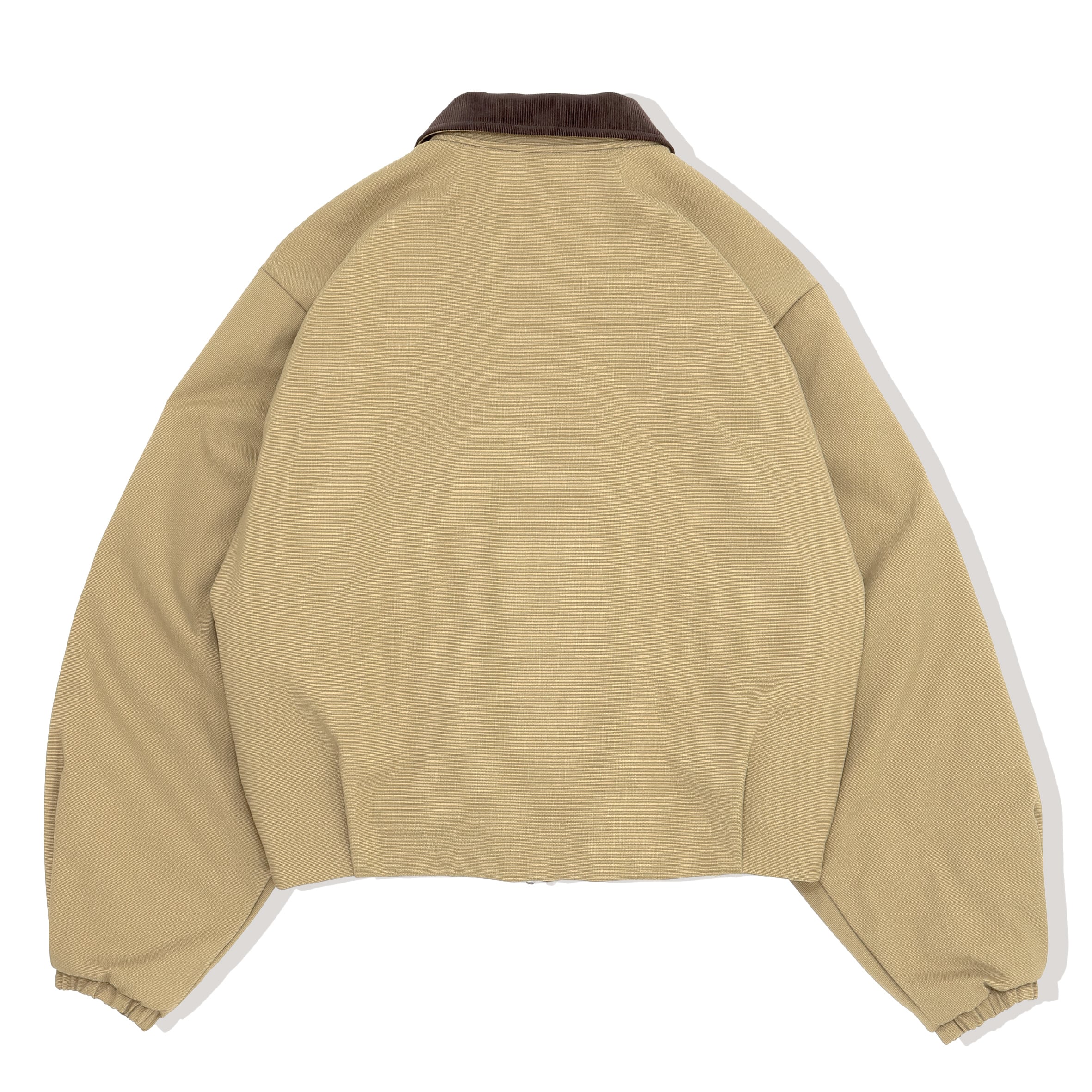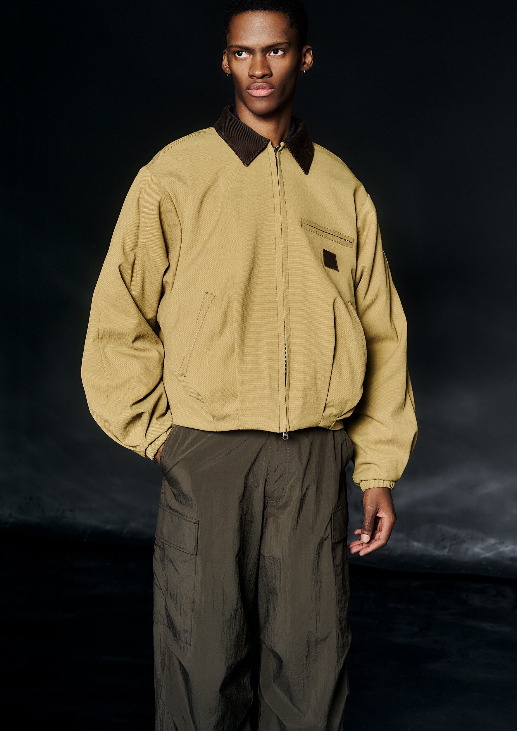 身頃裾、袖口部分に大振りなタックを配置し、本来のソレとは真逆のドレープ感のある柔らかな表情にパターンメイク。