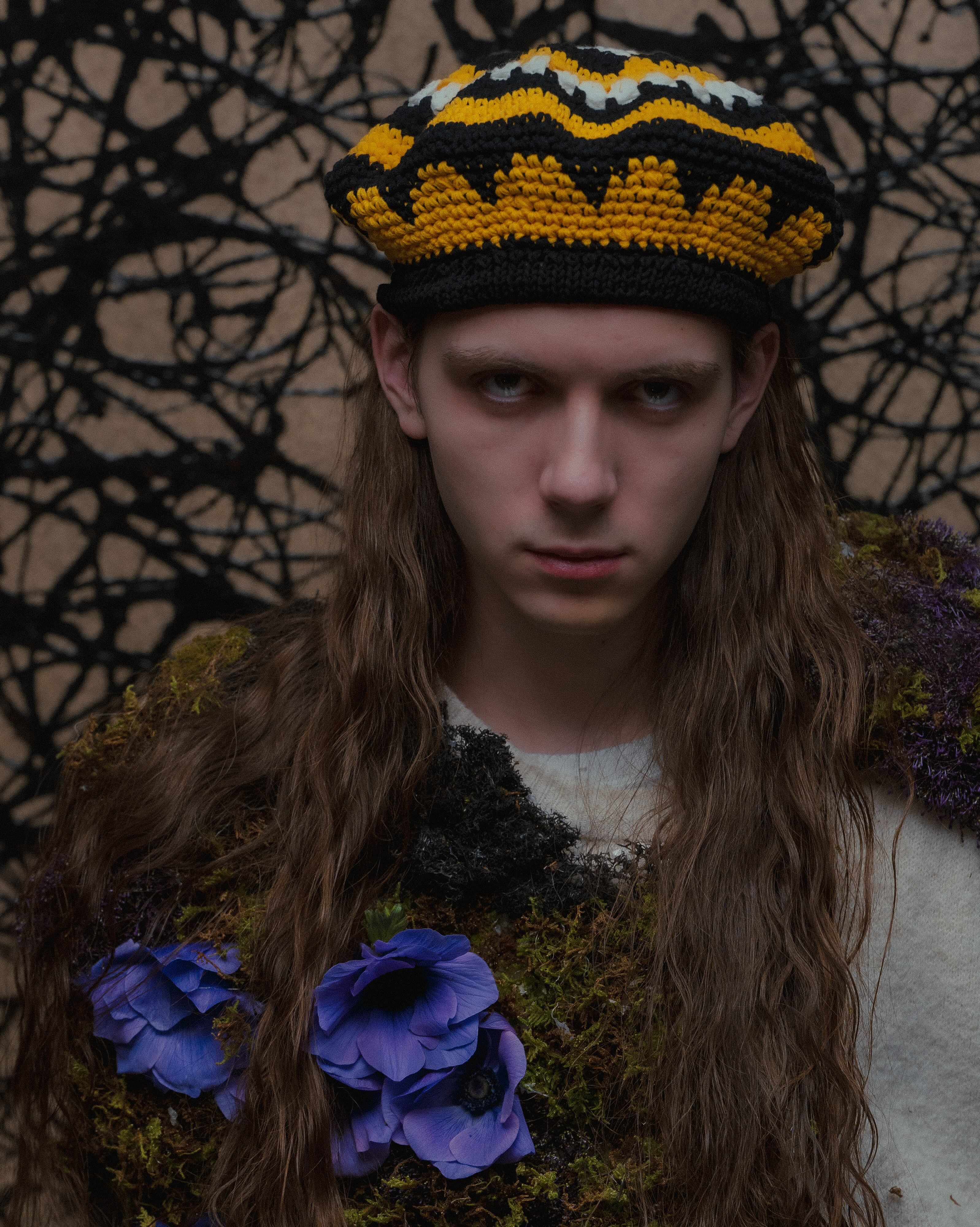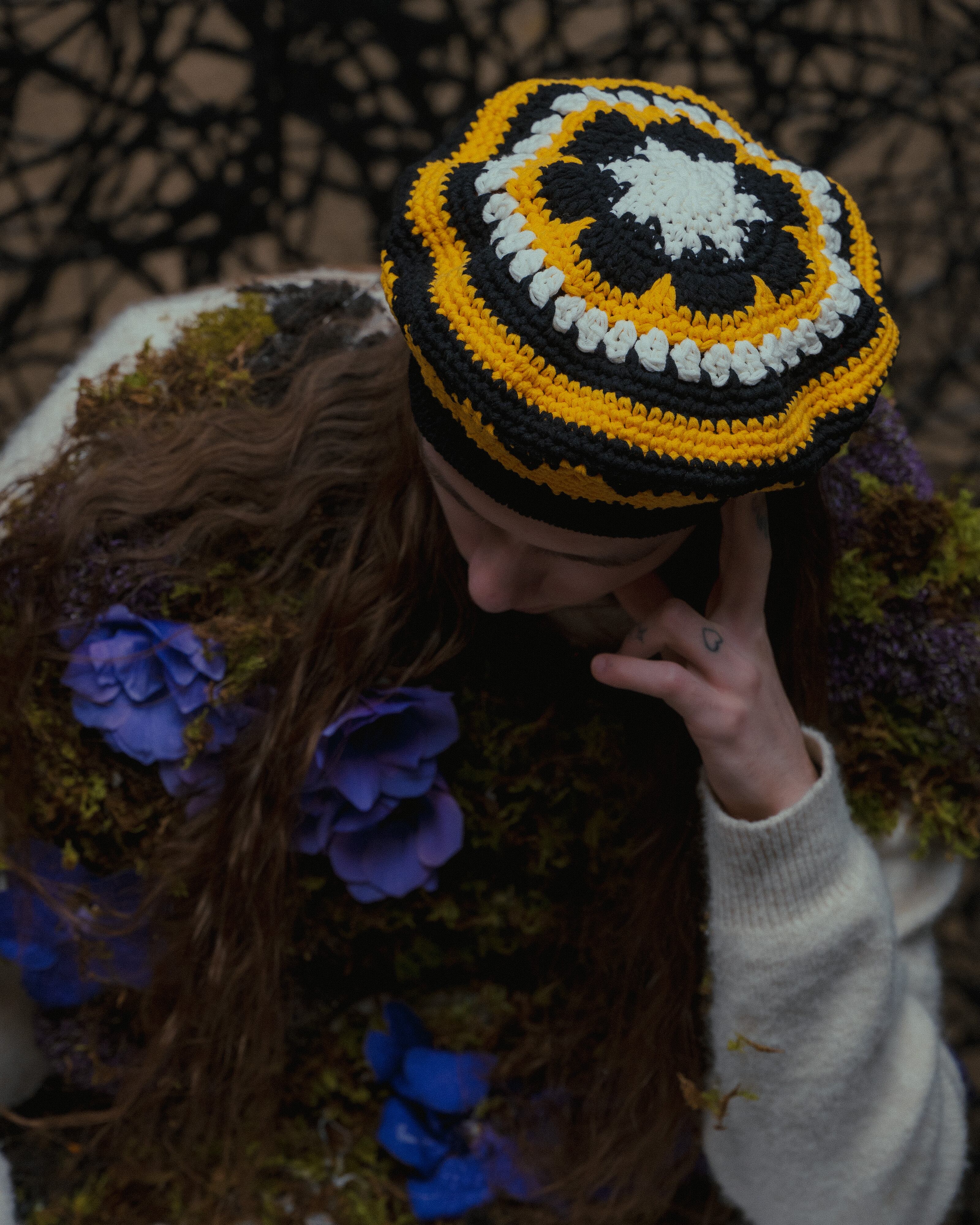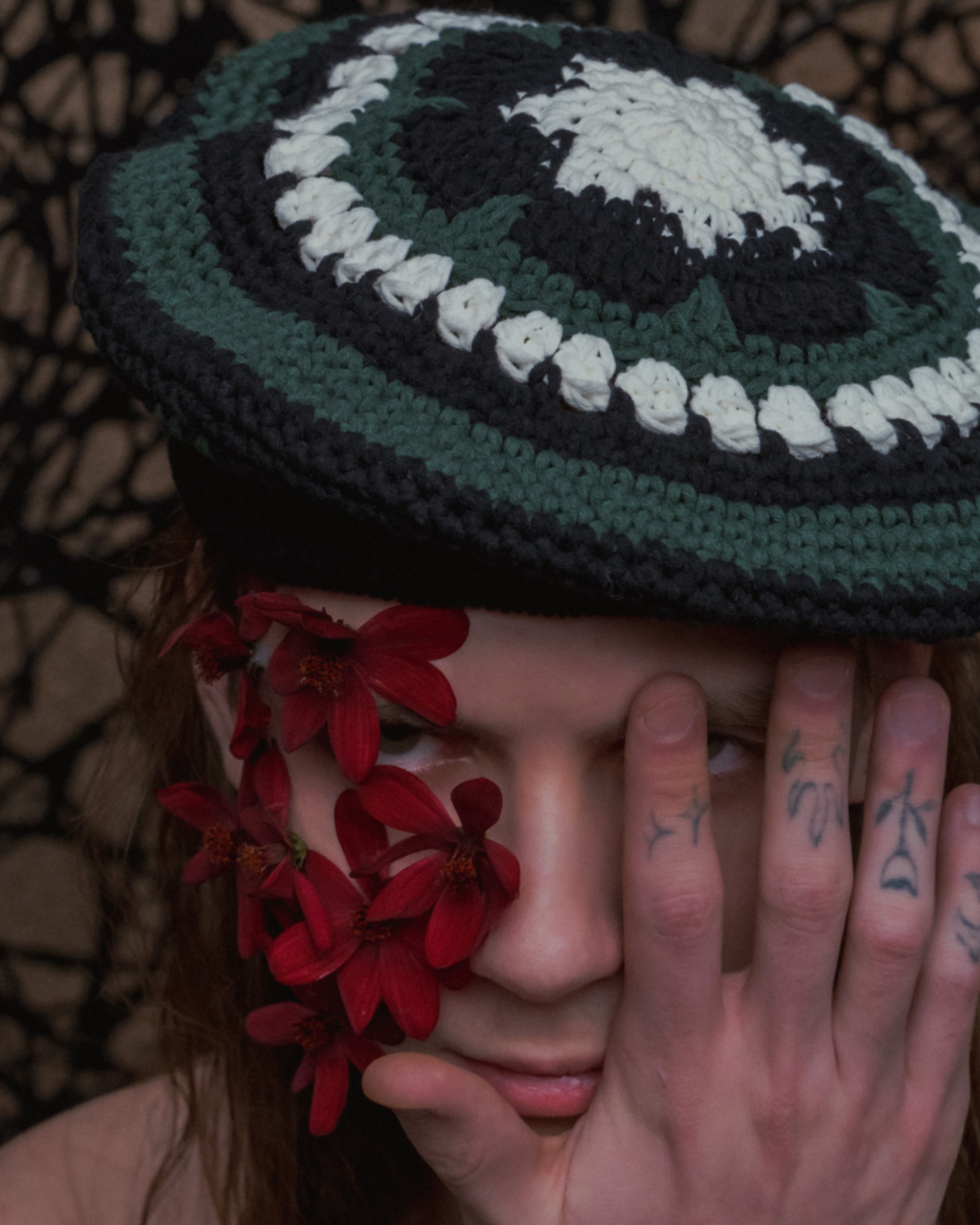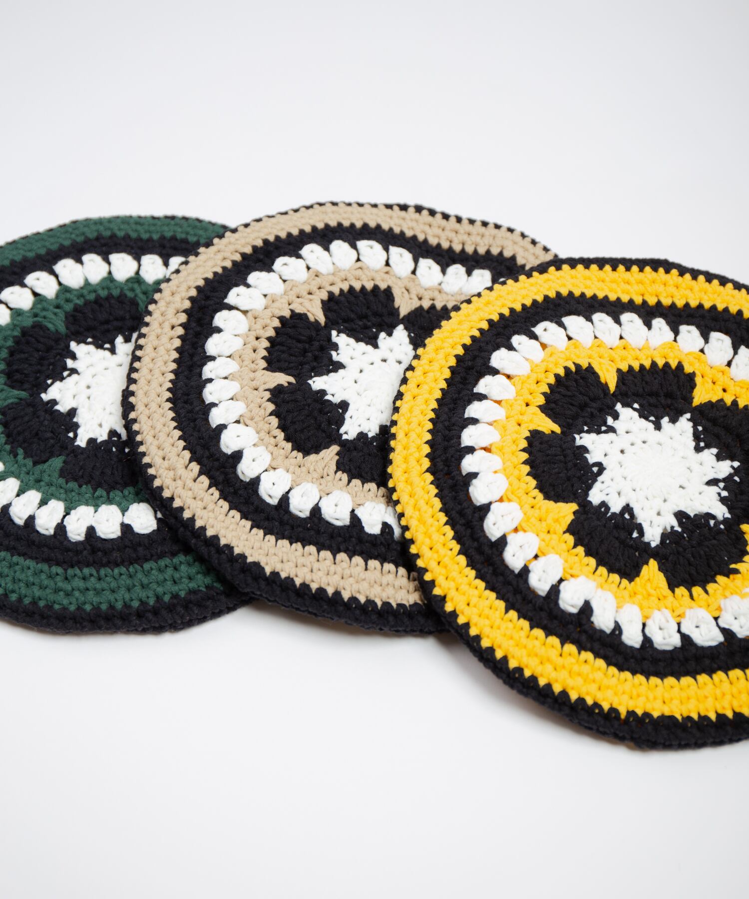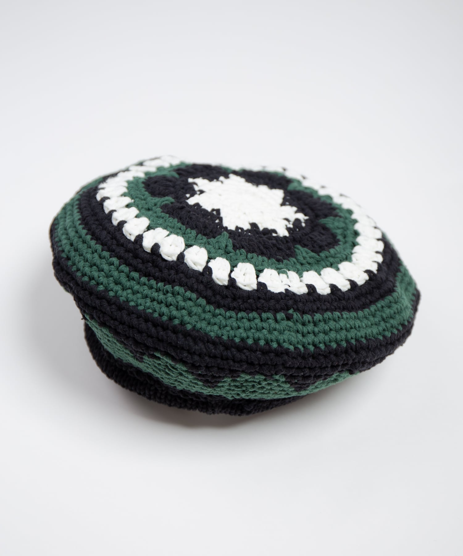 ハンドメイドで編み立てたフラワー柄ニットベレーです。コットン、アクリル糸を使用している為、しっかりとした編地とハリ感がありシーズン問わず着用頂けます。機械では表現できない手編み特有の表情感が特徴になっています。被り口には伸び止めのゴムを入れている為、被った時にフィットするようになっています。中性洗剤を使用してぬるま湯で手洗いすることが可能です。