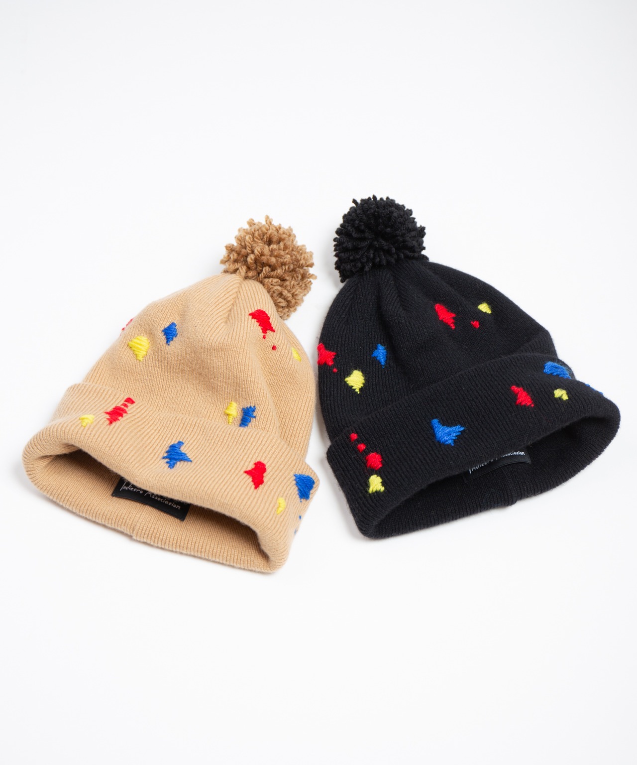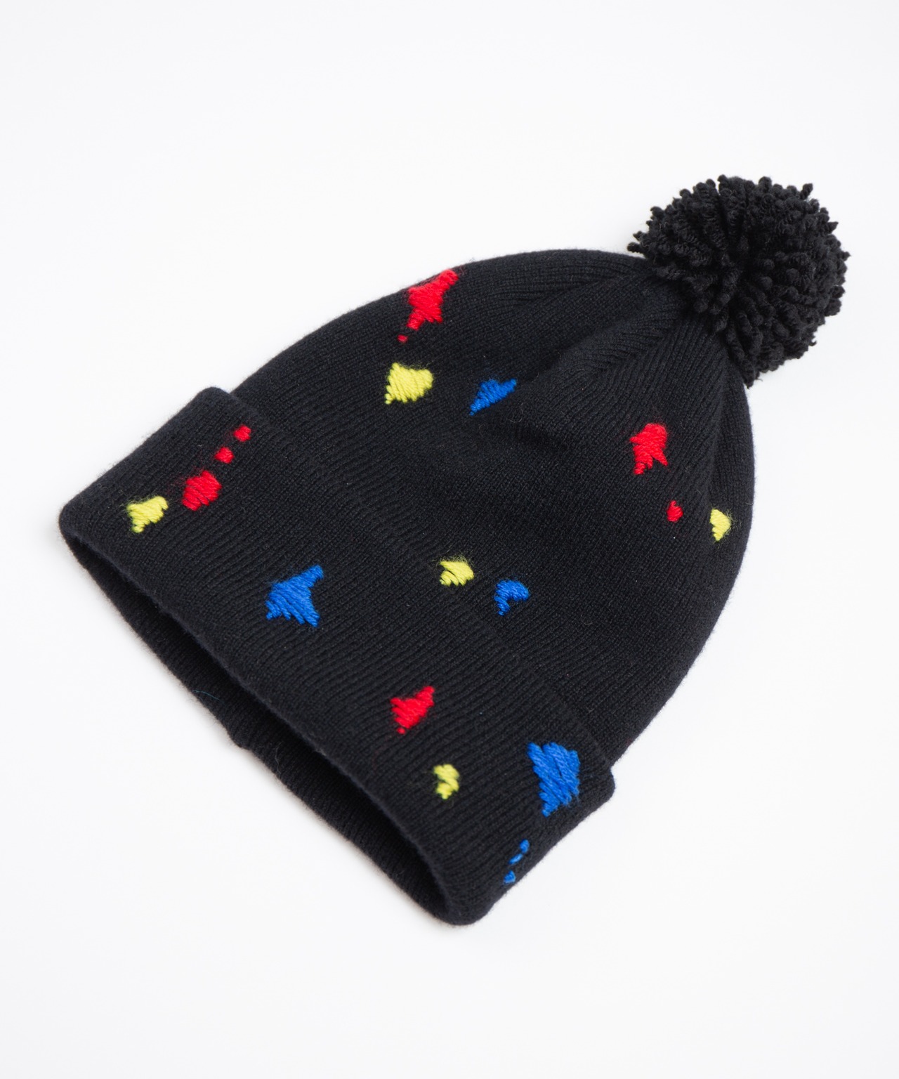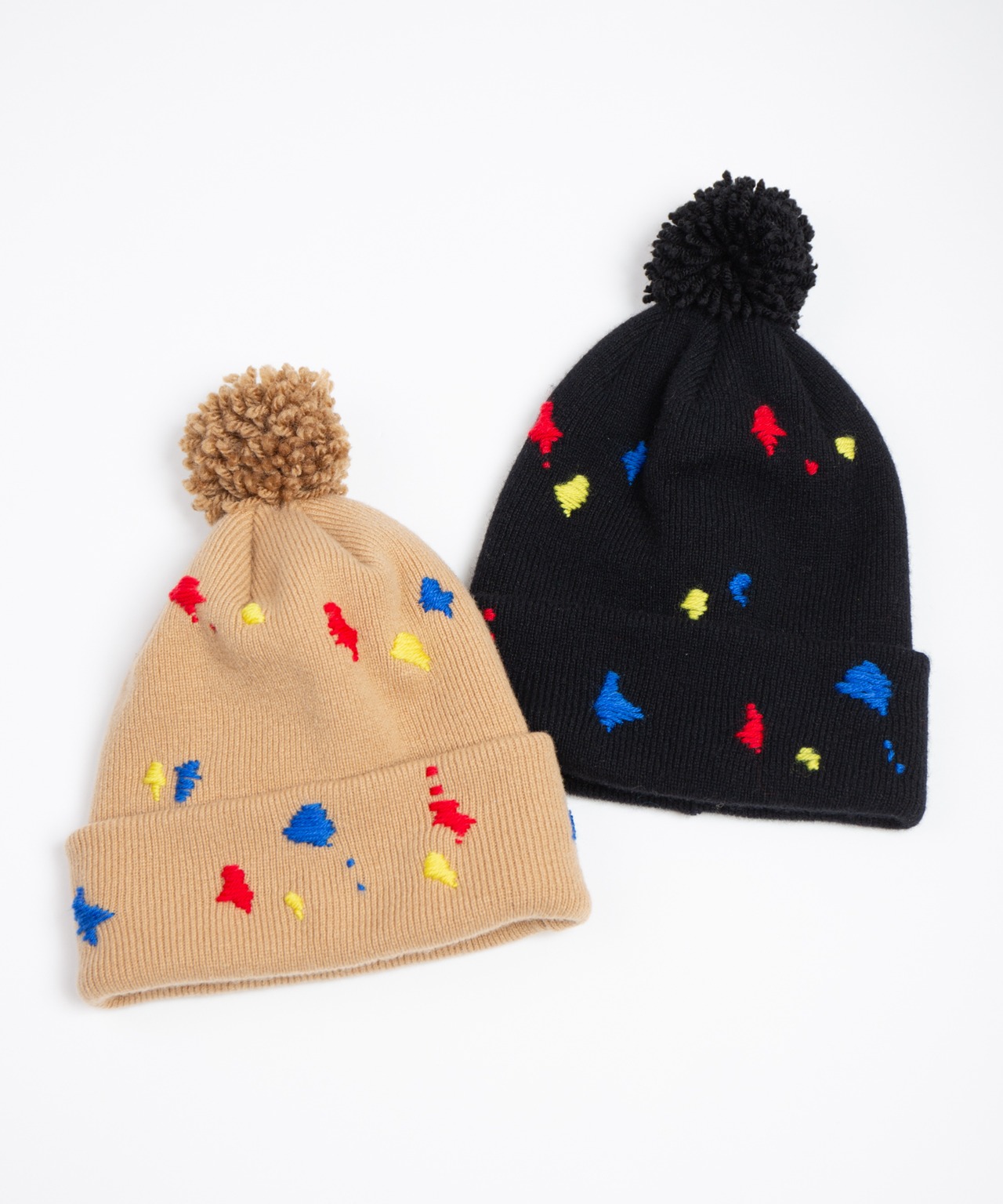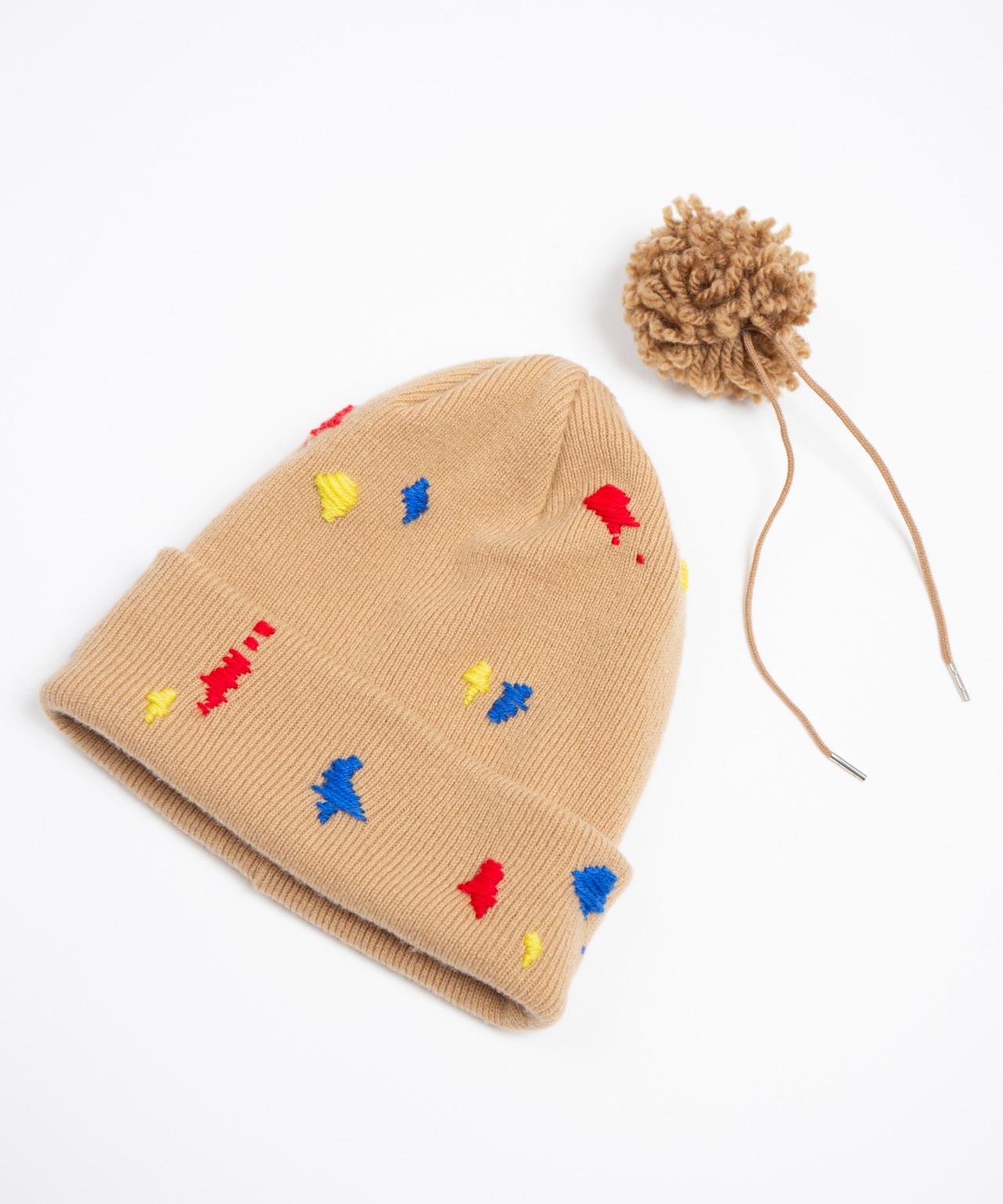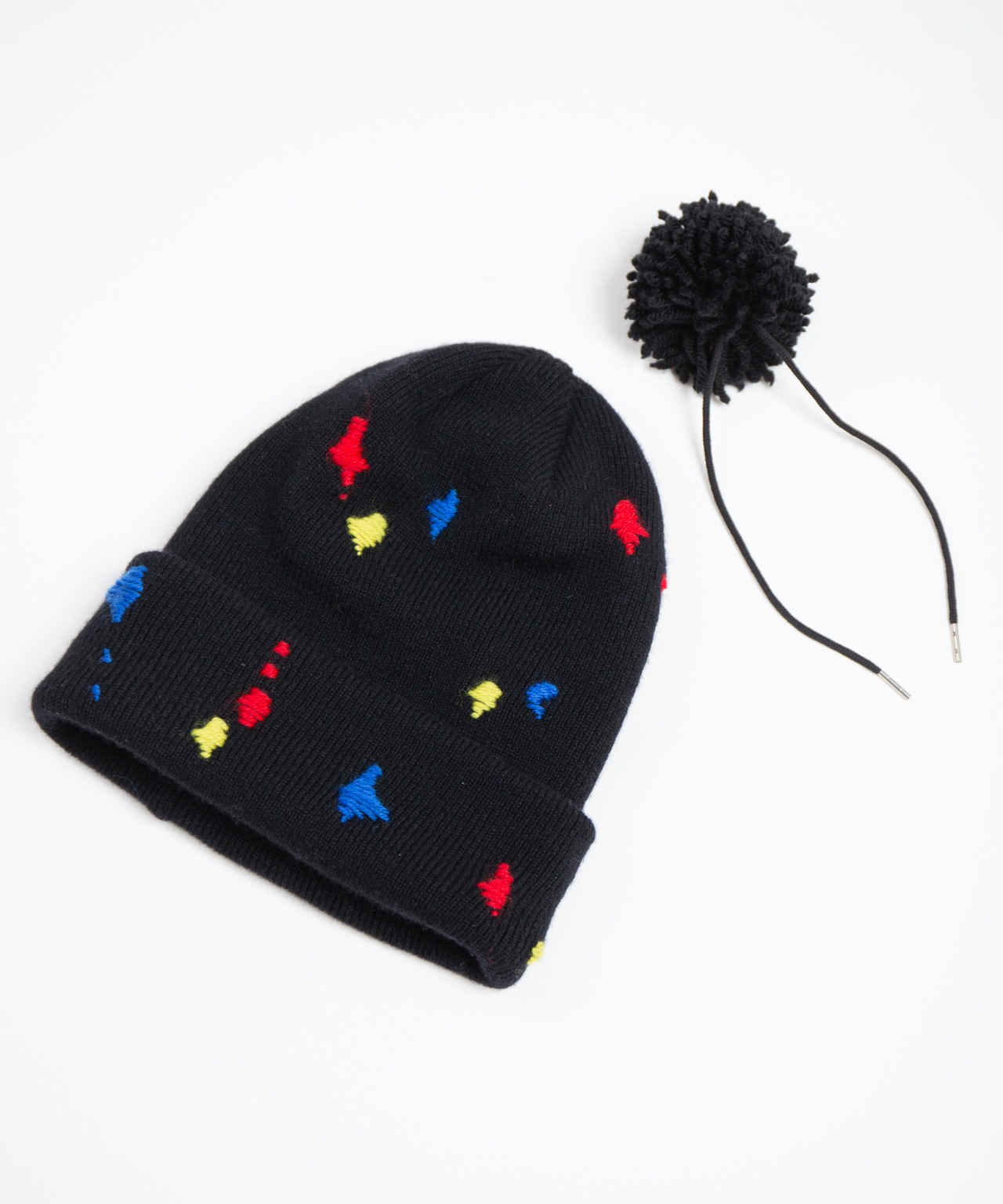 カシミヤ混ウール糸を使用したボンボン付きニットキャップです。メリノウールとカシミヤの混紡の糸は、肌触りが良く、保温性に優れているのが特徴です。ボディーにはペンキを飛ばしたような、ハンド刺繍を施したデザインになっています。ボンボンは、取り外しが可能な仕様になっている為、スタイリングに応じて2WAYで使用することが出来ます。