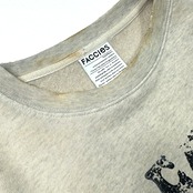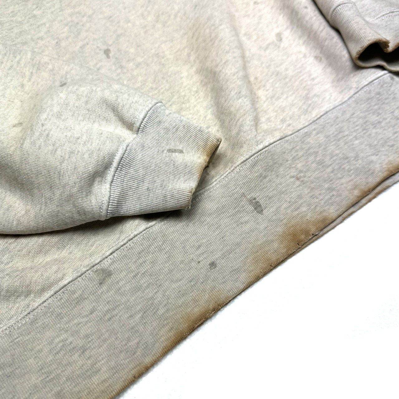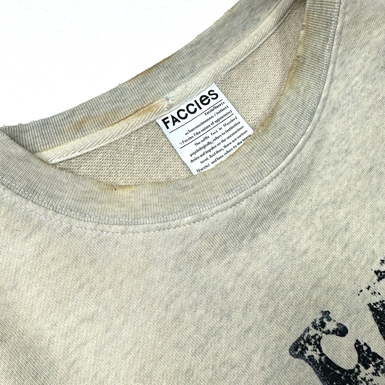 素材には定番の厚過ぎない裏⽑⽣地を使⽤し加⼯を⼊れたプリントスウェットになります。それぞれのカラーで加⼯の段階で独⾃のレシピで染め、ブリーチ、ダメージ、汚し、焼きと1点1点職⼈さんの⼿作業により絶妙な塩梅で仕上げた着古したスウェットを作成。プリントも加⼯前に複数の⼿法でプリントを⼊れておりその後に加⼯を⼊れる事でプリントが絶妙に削れ落ちて独特の雰囲気を醸し出しており⾮常に⼿の込んだ1枚になっております。シルエットは⾝⼱と肩を⼤きくしたドロップさせたシルエットのスウェットプルオーバーとなります。