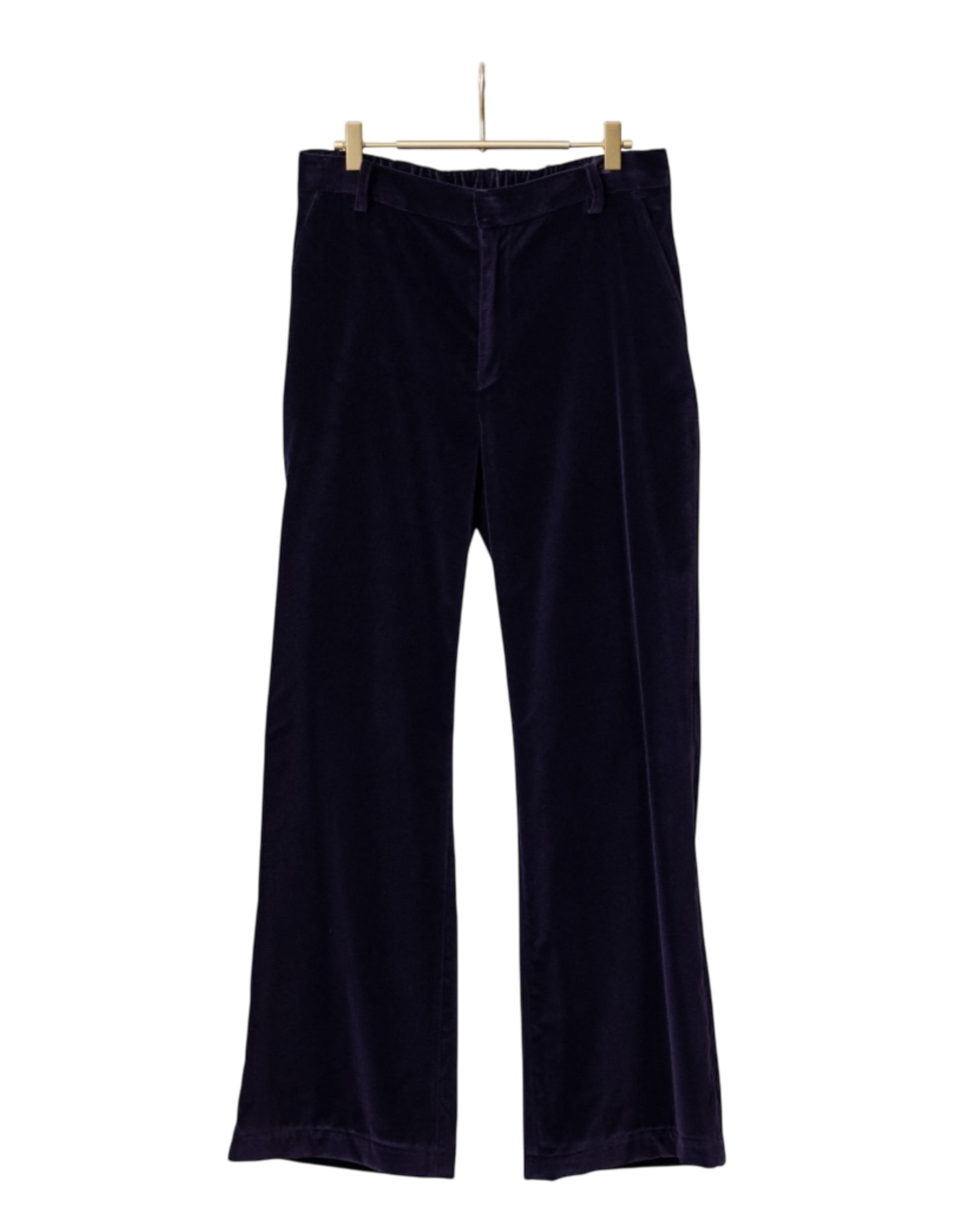 社会が常に自然と共存しながら進み、伝統と融合していく感覚の意味。ウェイトと柔らかさを持ちあわせたコットンレーヨンのベルベットで仕立てた新型のスラックス。ブランドの定番として製作していたセミフレアシルエットをより日常の動作や装いに合わせアップデートしたサイズバランスとアウトラインが特徴。滑らかなベルベットの質感と品のあるダークパープルの色味は同素材のジャケットとのセットアップ着用が可能。国内のスラックス工場で仕立てた丁寧な割り縫いやウエスト周りのギャザー始末などカジュアルに着用出来る仕様でありながら着用時の印象は本格的なスラックスとなる完成度を追求。