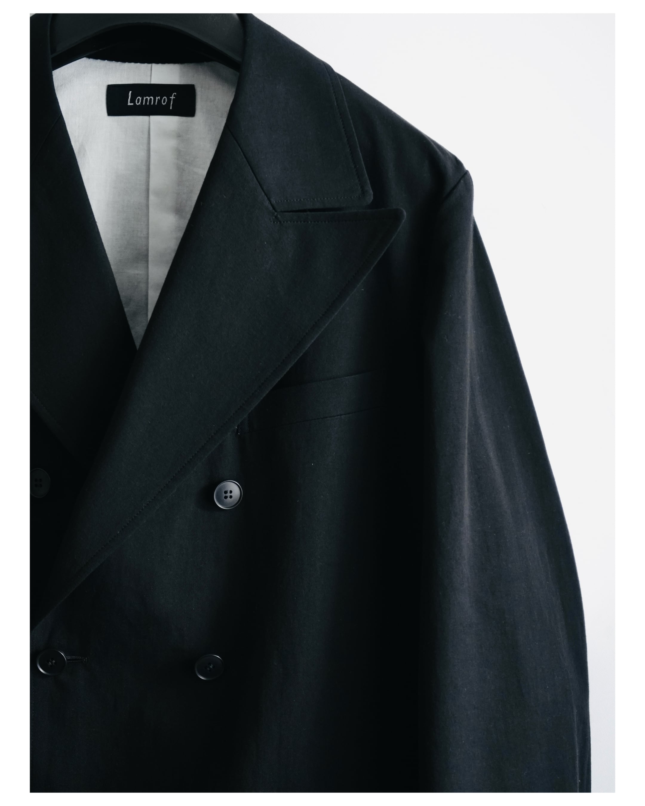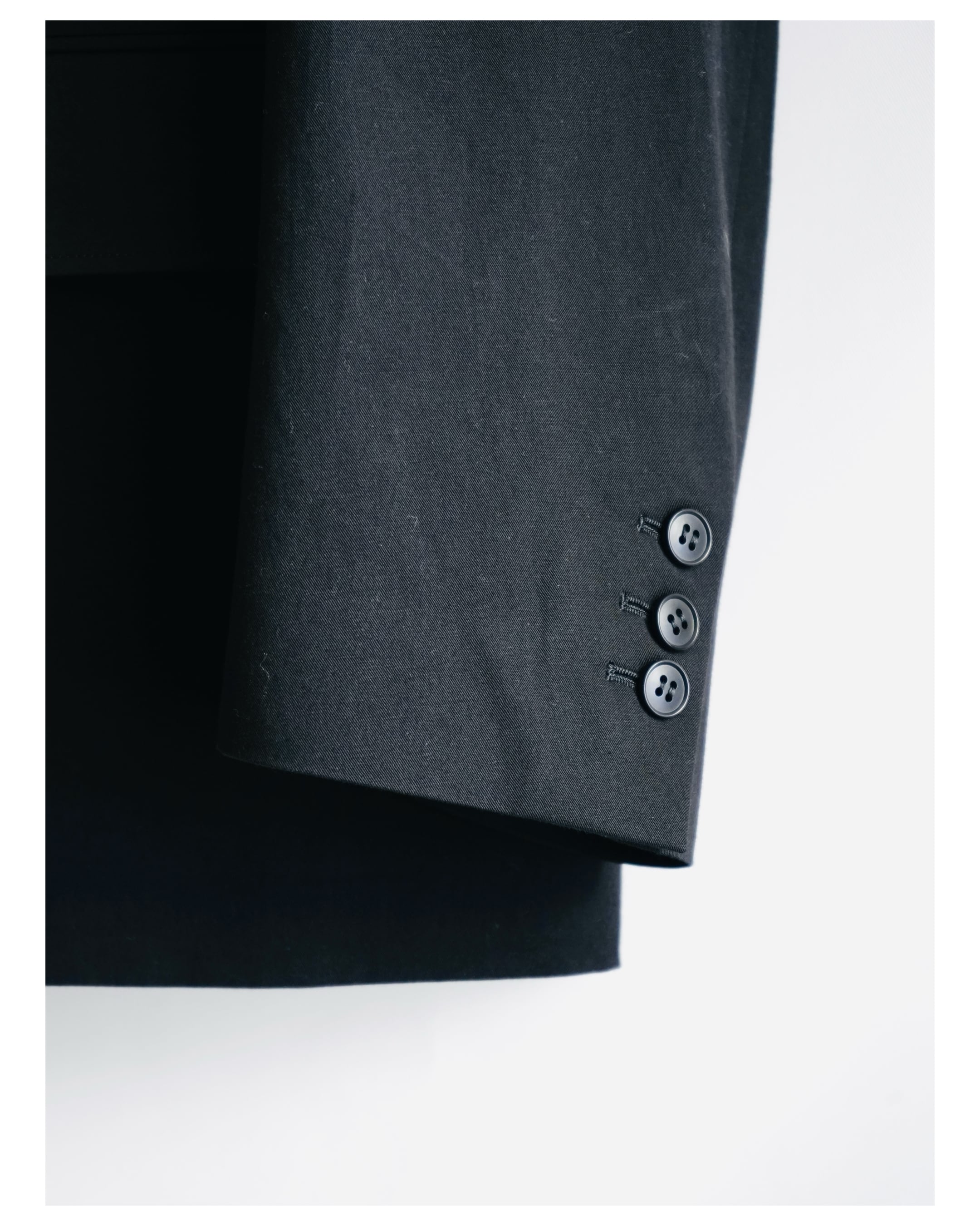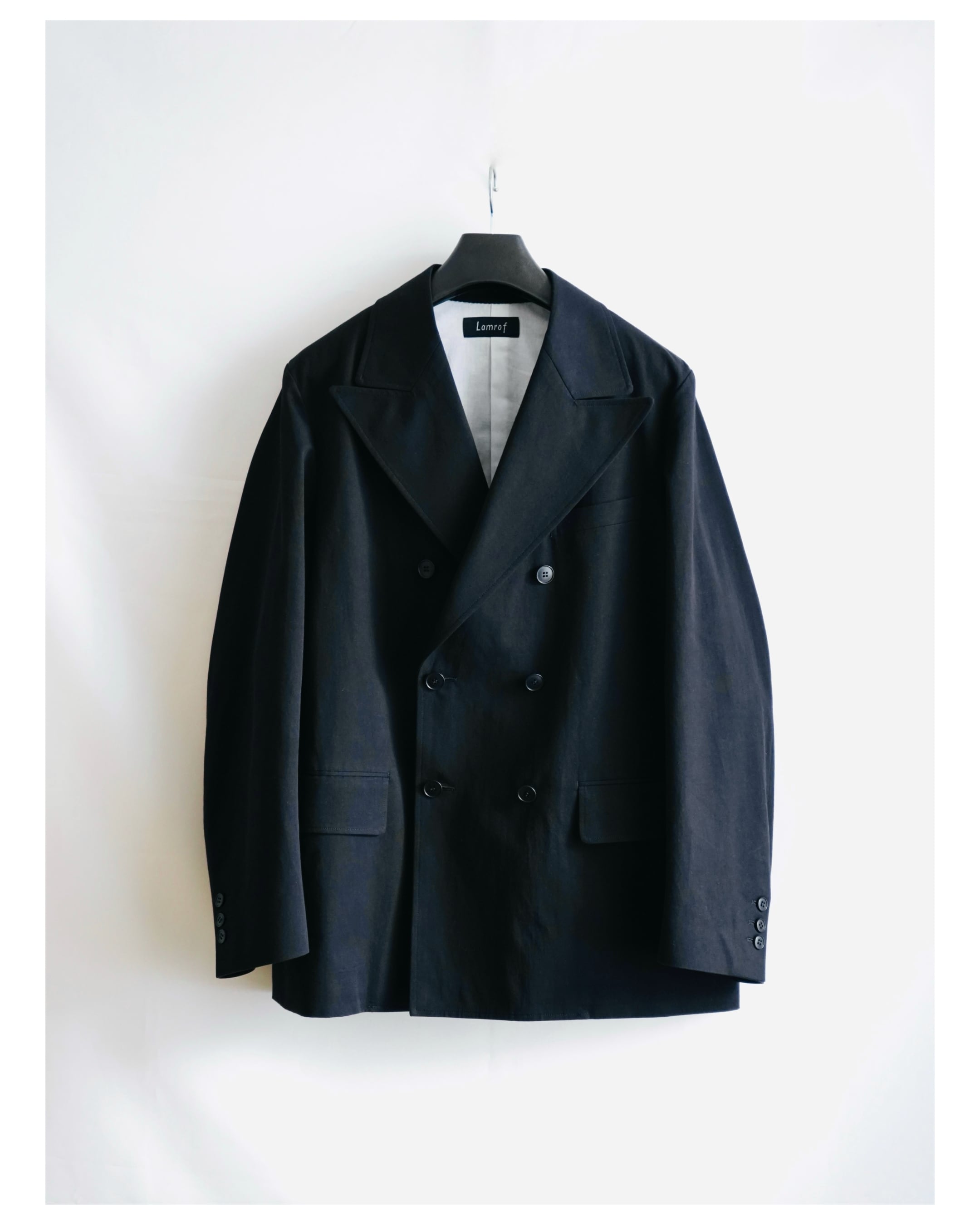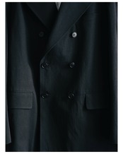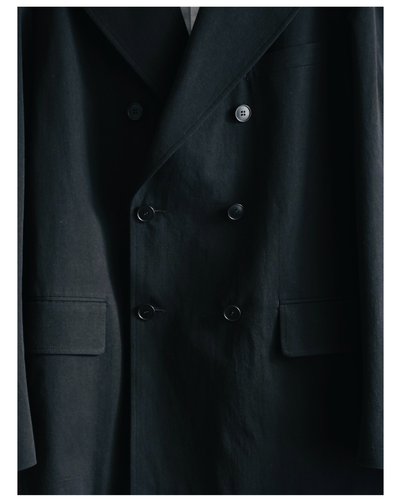 ジャズアーティストのブラックスーツの装いからインスパイアし製作した、上品な表情と季節を問わない実用性を両立した高密度なコットンリネンツイル素材で仕立てたダブルジャケット。経糸は表面の毛羽をガス焼きしたコットン、緯糸にはリネンの混紡糸を使用して素材の奥行きが感じられる生地構造で組み、洗いと揉み込みの工程を組み合わせることで高密度素材の反発感は残しながら膨らみと柔らかさを引き出して使用。肩は落とさず立体的なアウトラインと前振りの袖付けで組んだベースパターンと、国内のテーラーによる部分的に手縫いを含んだ縫製によってリラックスしたサイズバランスとシャープなルックスのバランスを構築。ブランドのアイデンティティを日常に落とし込んだマスターピースとしての1枚。