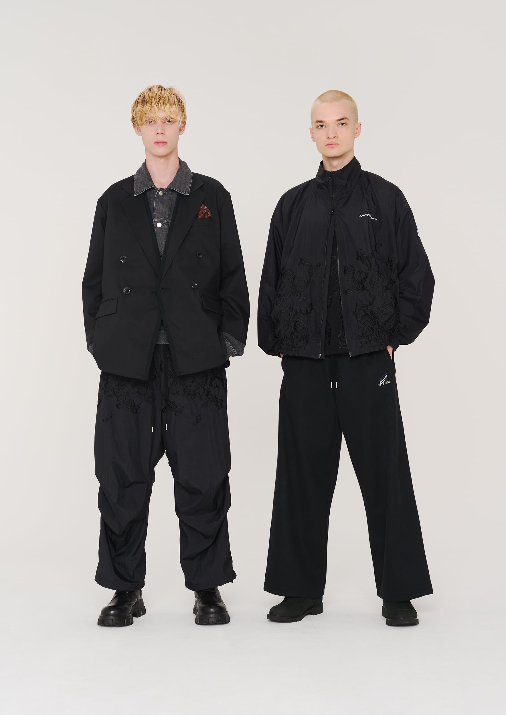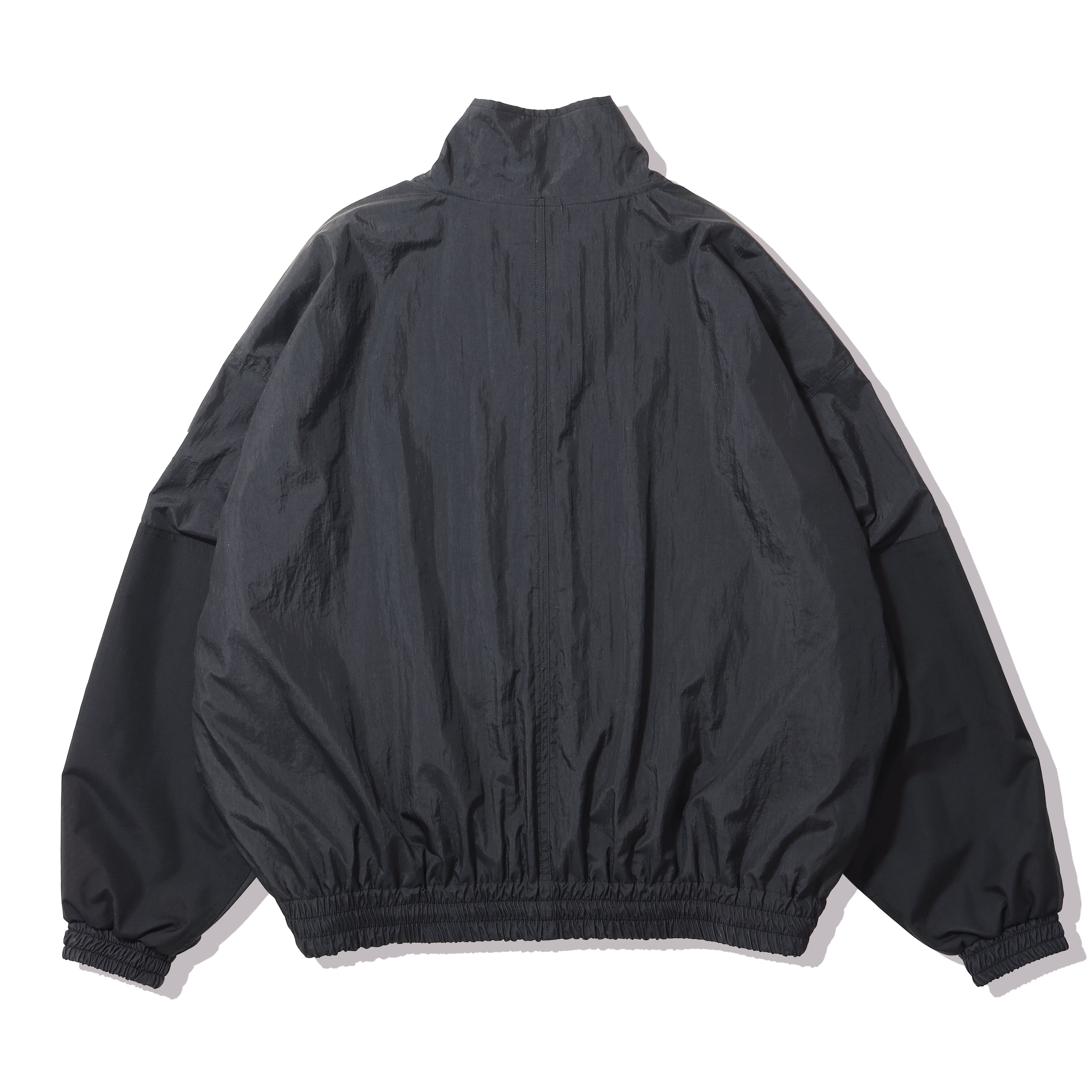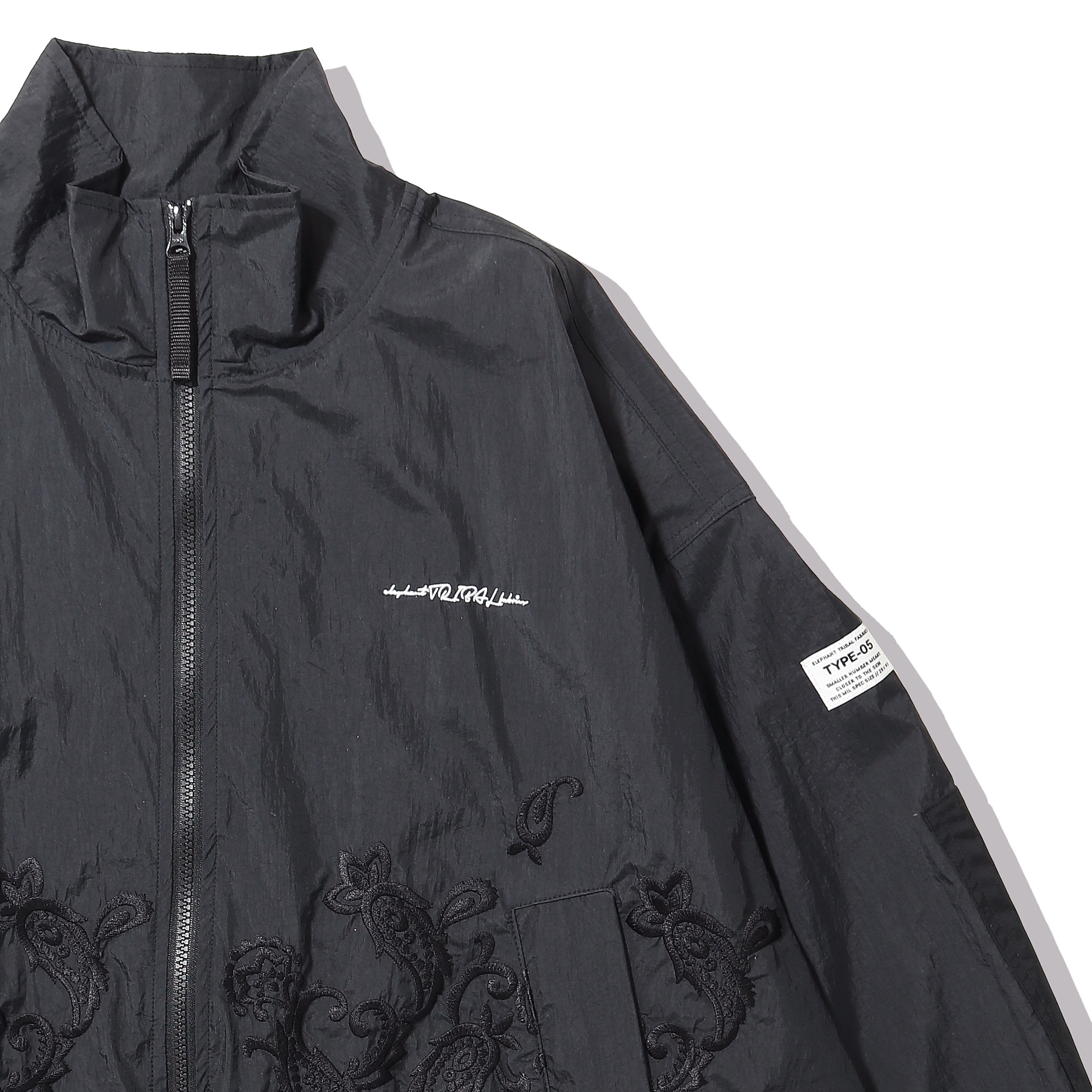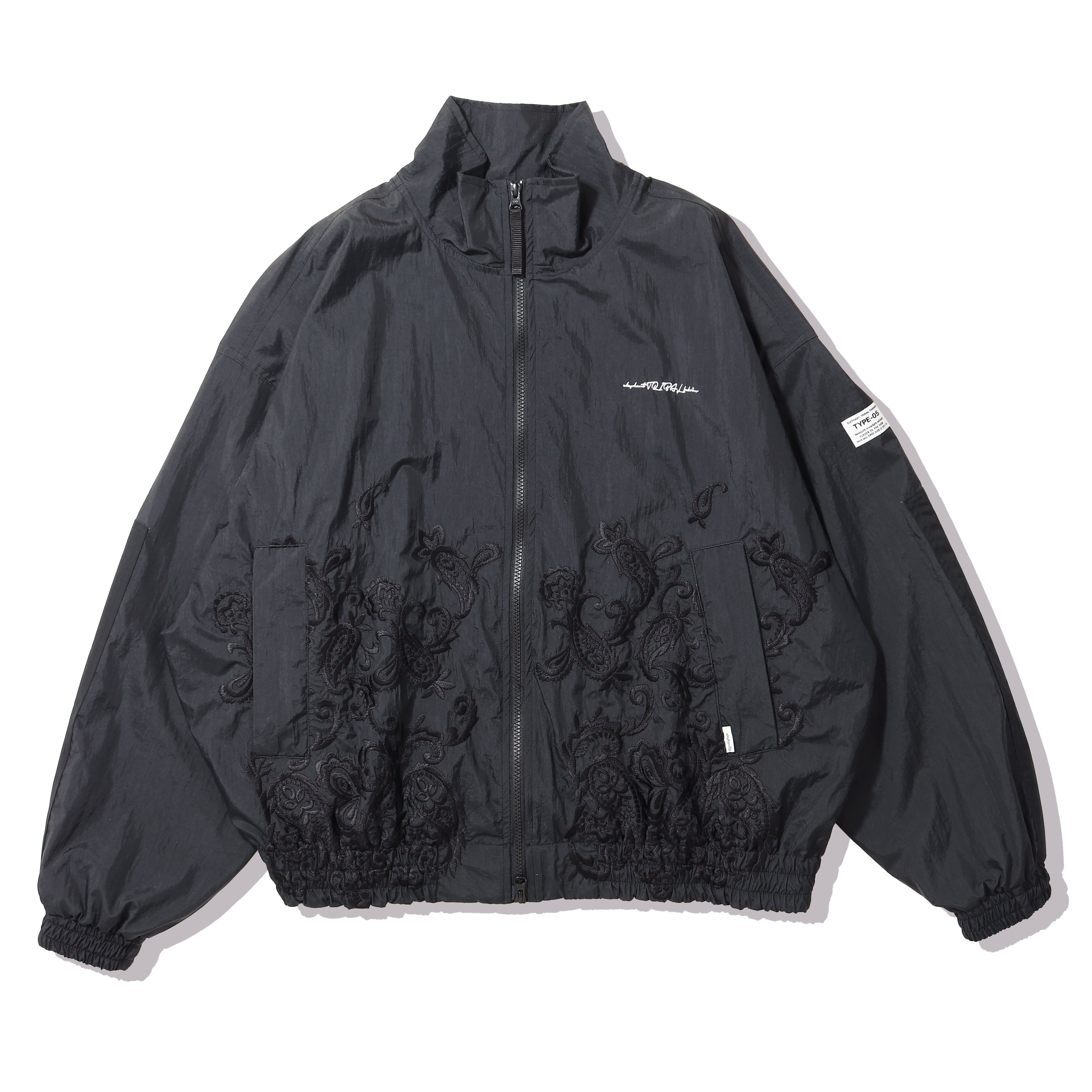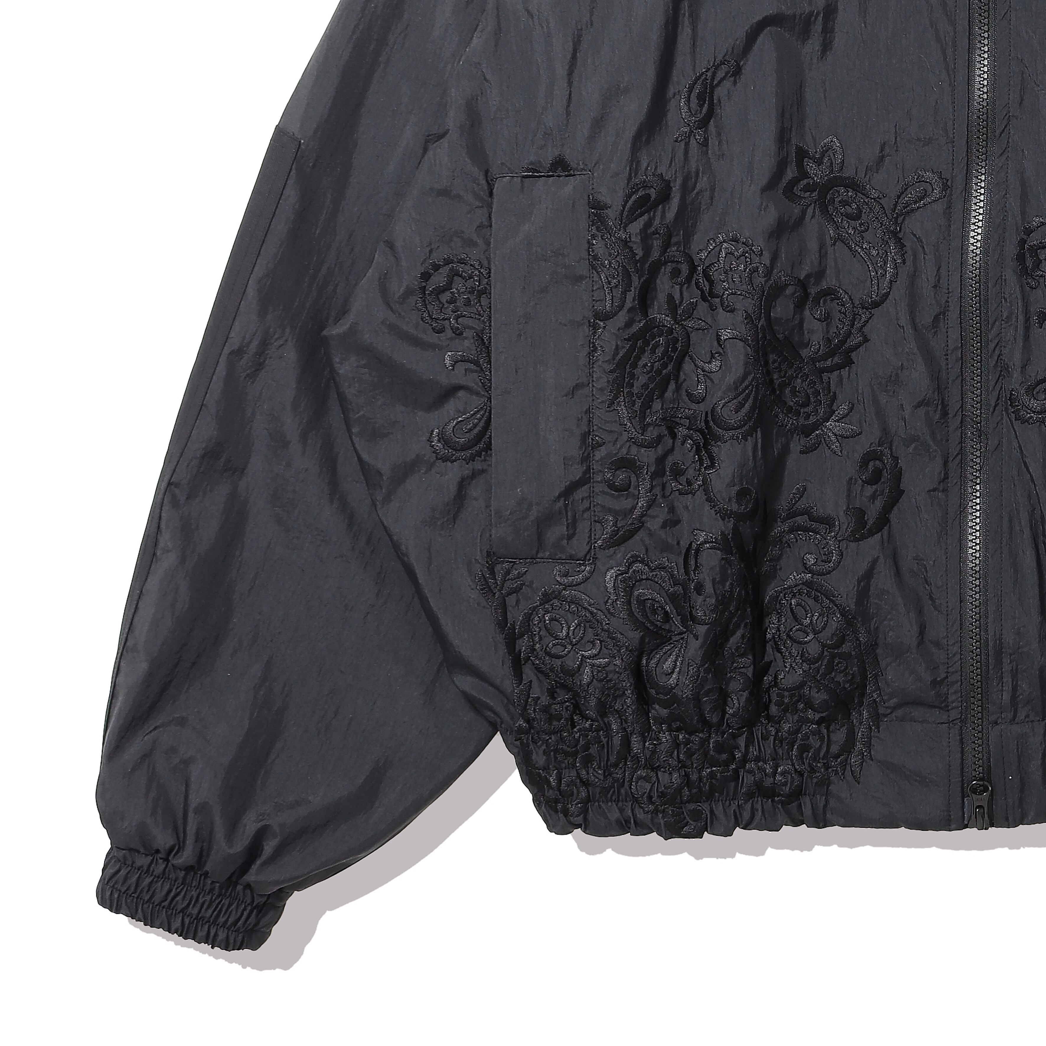 シルエットは非常に大きく取った身幅、肩幅、アームホールに対しショート丈に設定したボックスシルエット。フロント中央から裾にかけてペイズリー刺繍を配置。胸元にはブランドロゴ刺繍をを配置。表地は、ワッシャー加工を施した撥水性に優れたナイロン素材を使用。
