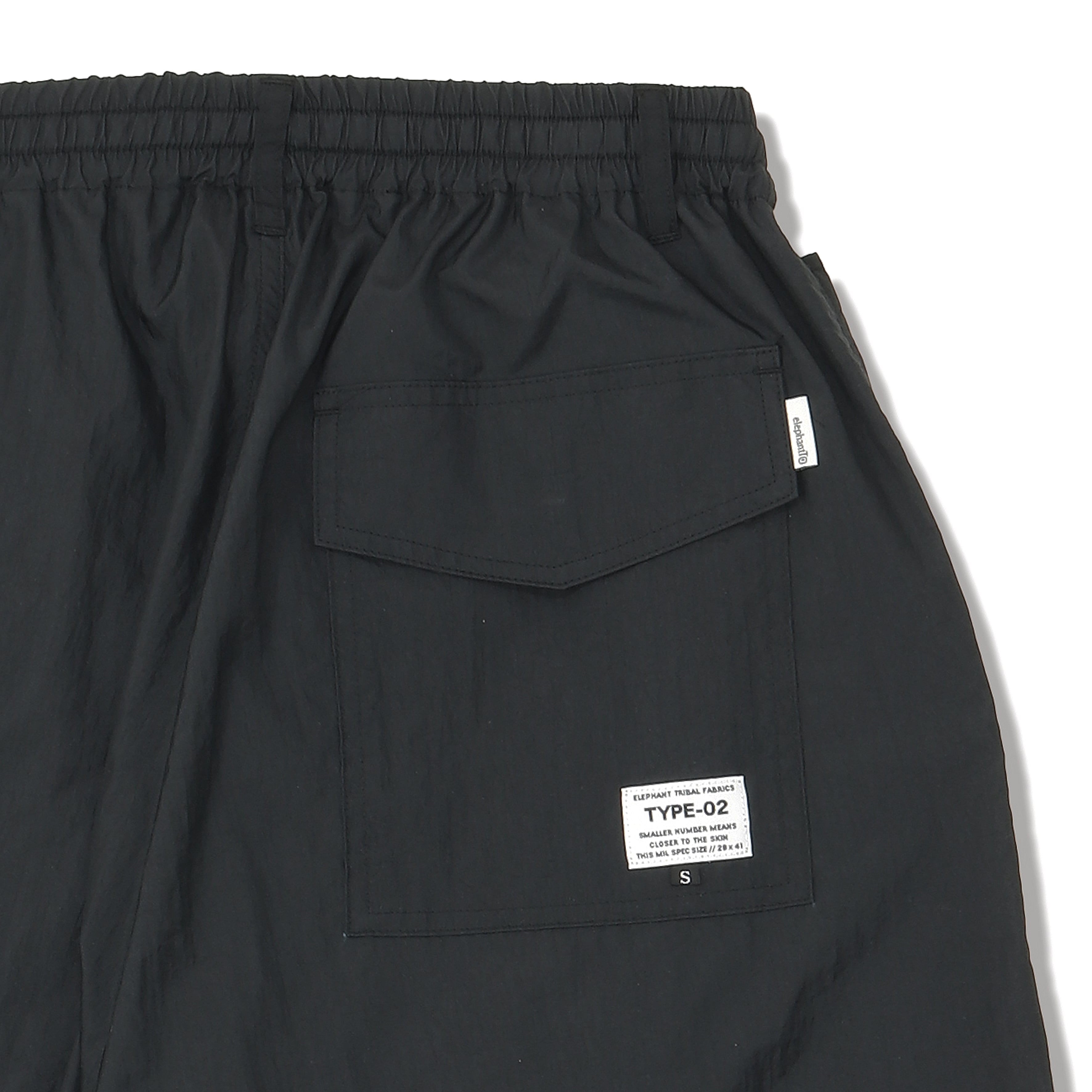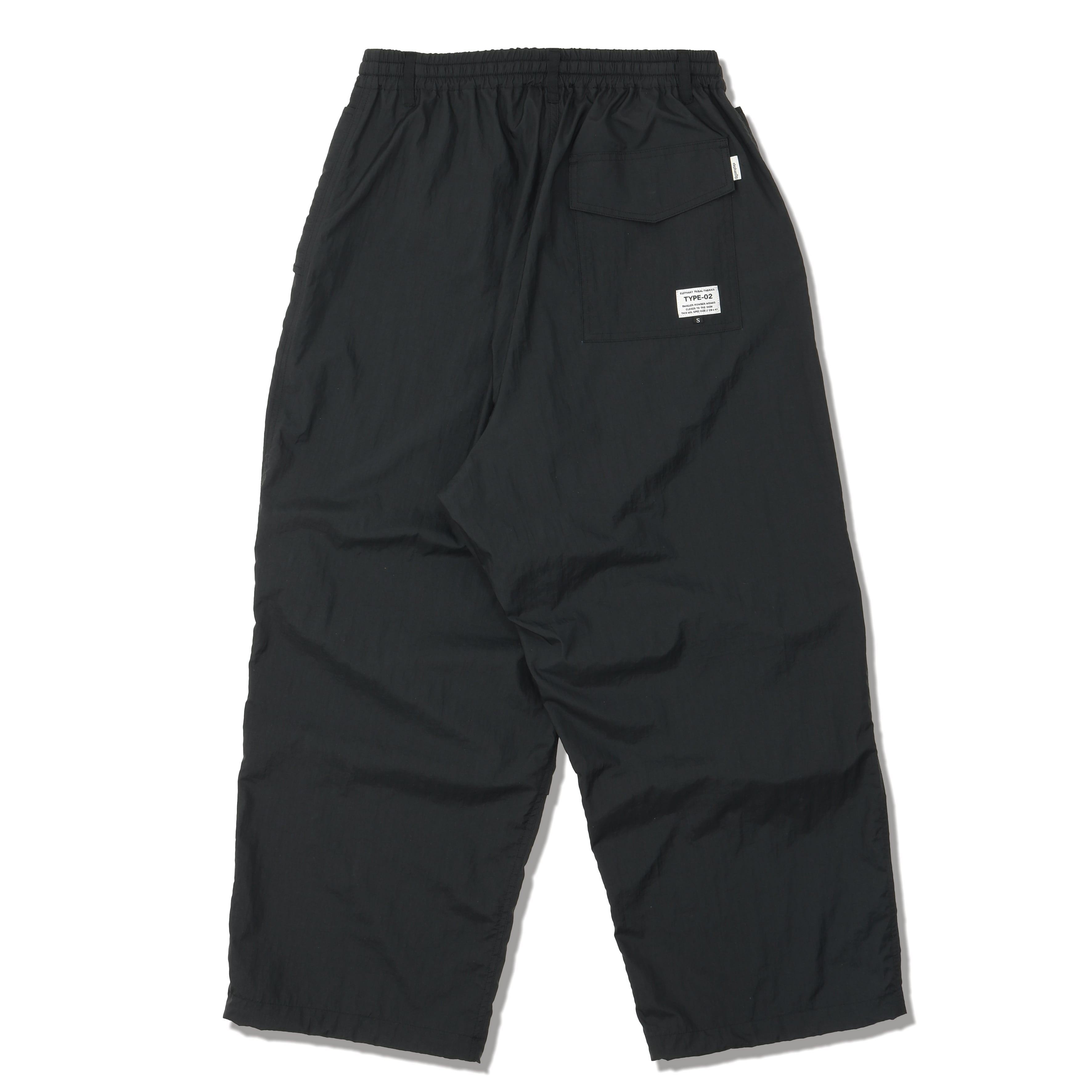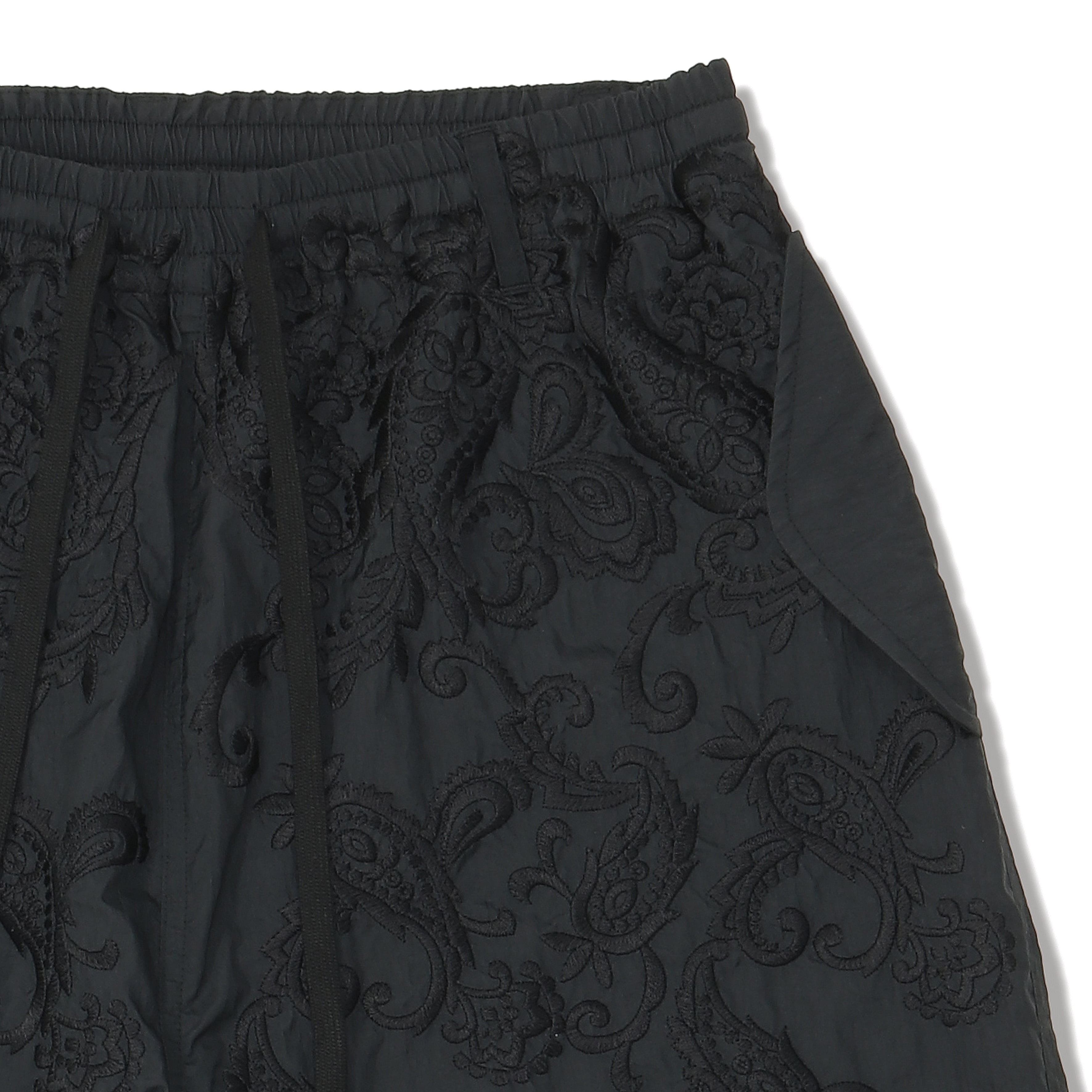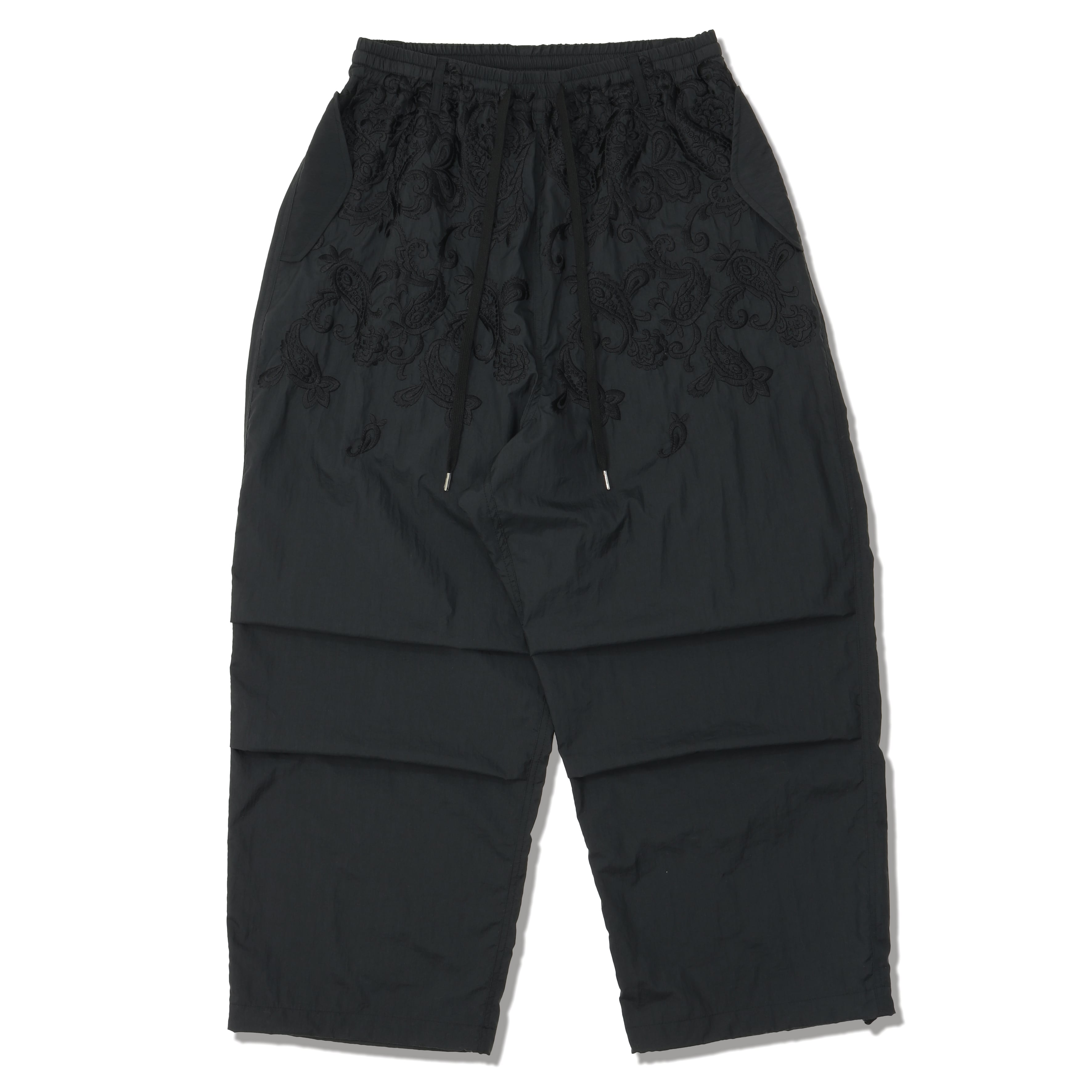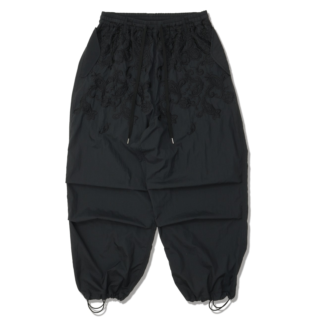 本来は付いていないポケット袋布やベルトループをプラスし、スノーカモパンツをタウンユース用に落とし込みました。ウエスト上部から下部にかけてペイズリー刺繍を配置。表地は、ワッシャー加工を施した撥水性に優れたナイロン素材を使用。肌離れを良くするために裏地には、吸水性・速乾性に加え、静電気の発生を抑える制電糸を使用した、ドライタッチの細かいメッシュ素材を採用。イージーパンツ仕様。スピンドル配置。裾部分にもシルエット変更出来るようドローコードを配置。