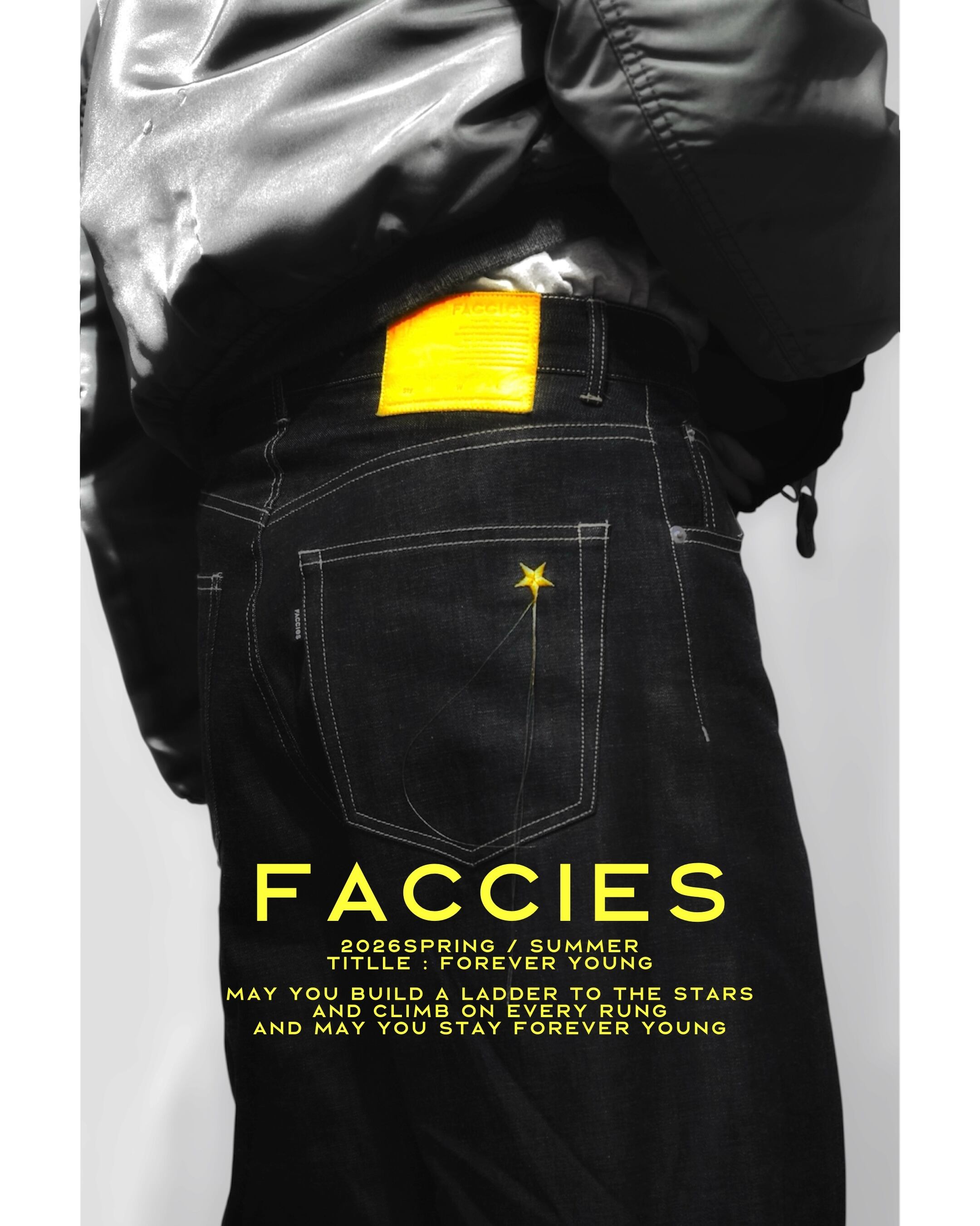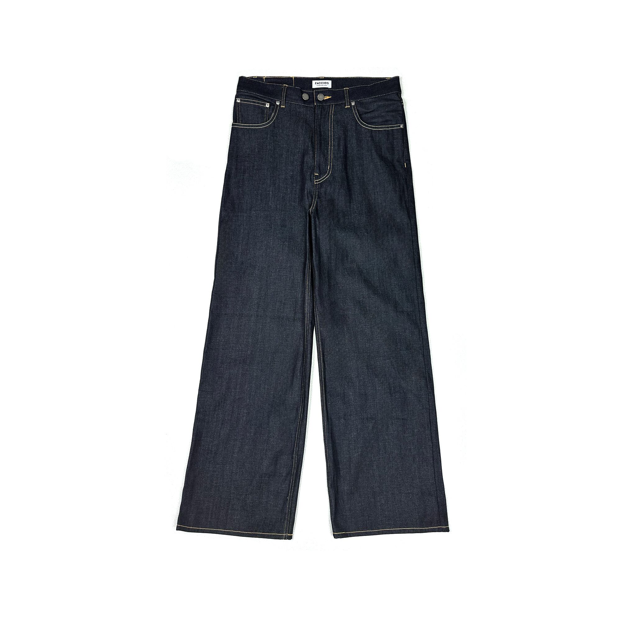 ドライ感の出るライトオンスデニム⽣地をチョイス。シルエットは1970年代初頭にカウンターカルチャーから流⾏したBAGGYPANTSのディティール。股上を深めに設定、ヒップから裾にかけてワイドにパターンメイク。こちらはリジットタイプとして展開。個⼈でエイジングを楽しんで頂きそれぞれ各々のアタリ感を育てて成⻑させて頂くためのアイテムになります。右のバックポケットにはFACCIESのアイコンのトゥウィンクルスターの刺繍と星の流れる様を⽷を垂らす事で表現。ウエストのネオバは2箇所付けておりより絞れるように設計。個⼈個⼈でのエイシングを楽しんでください。