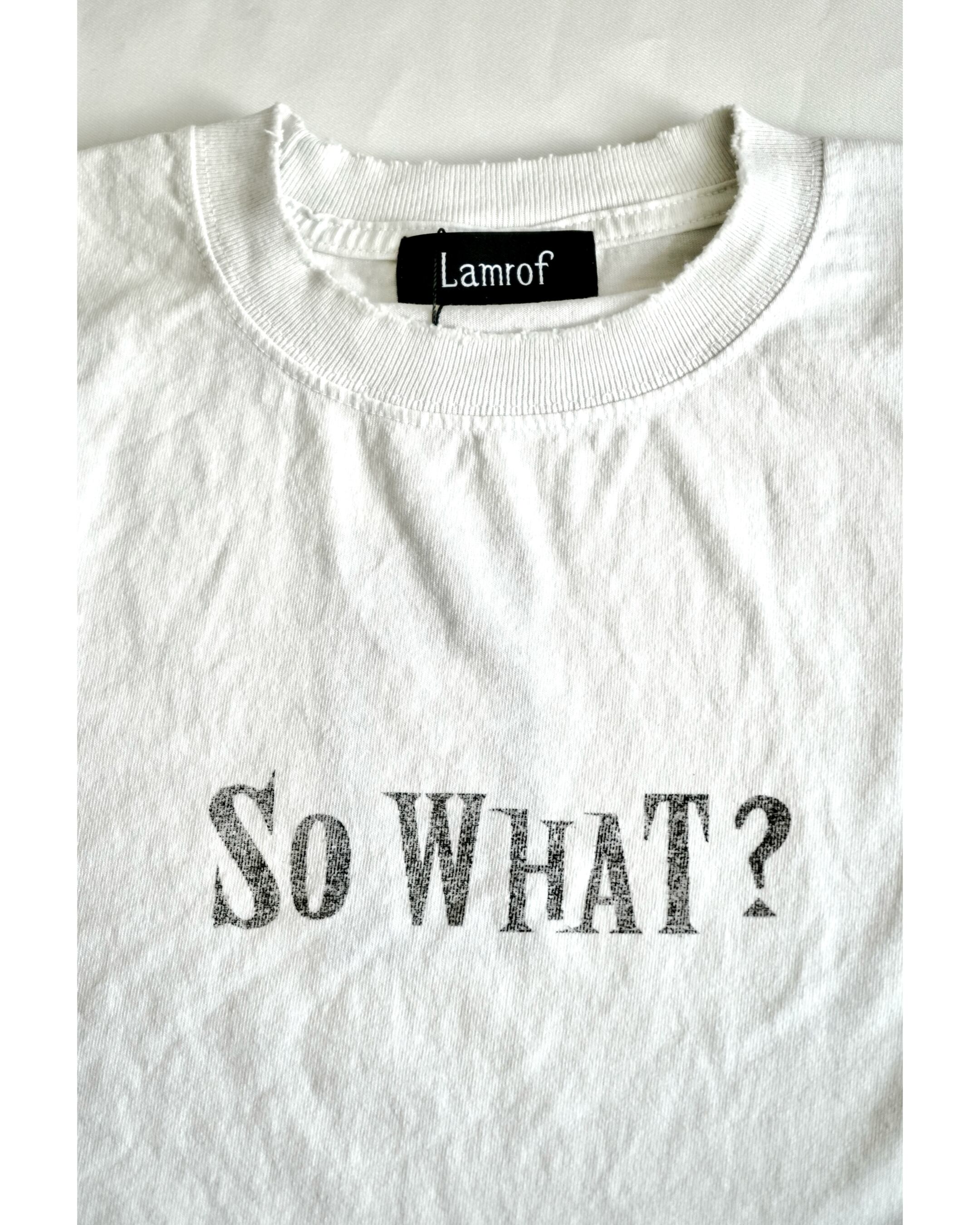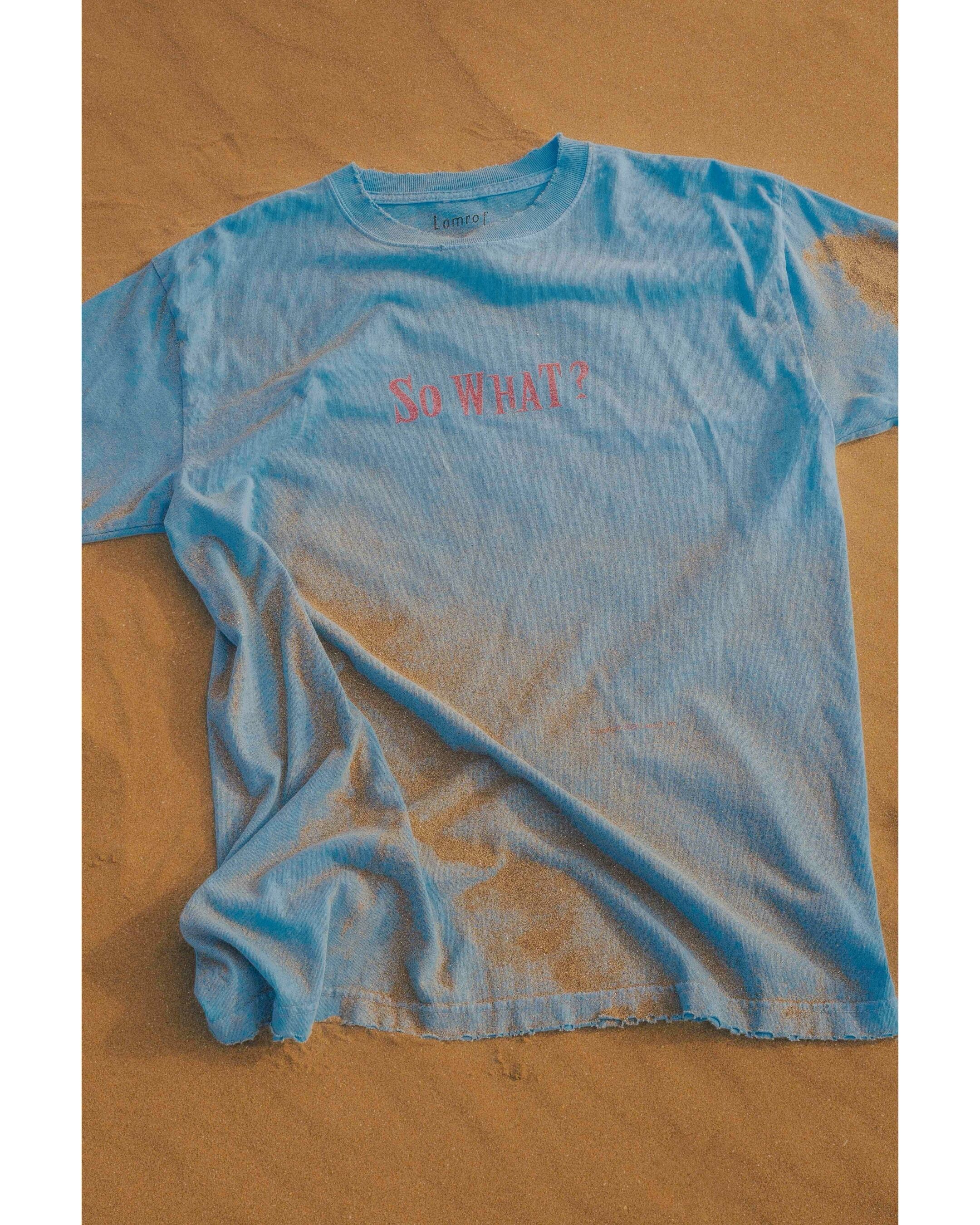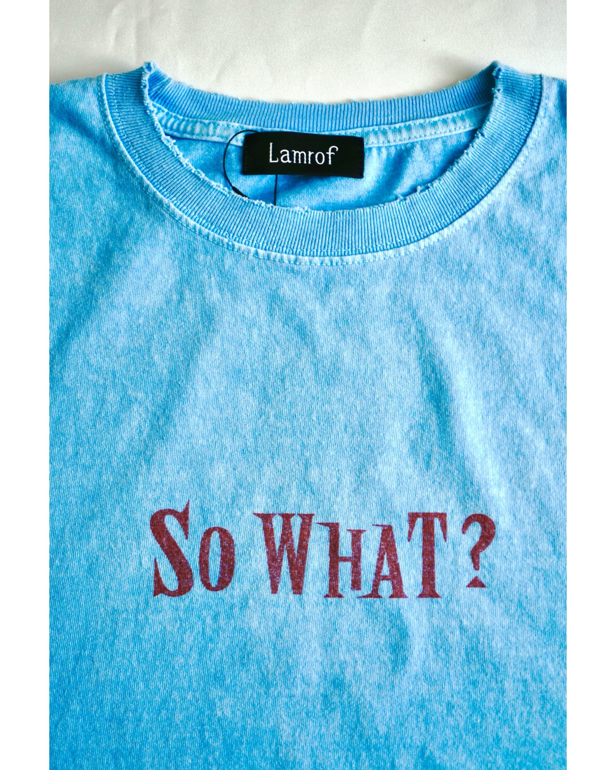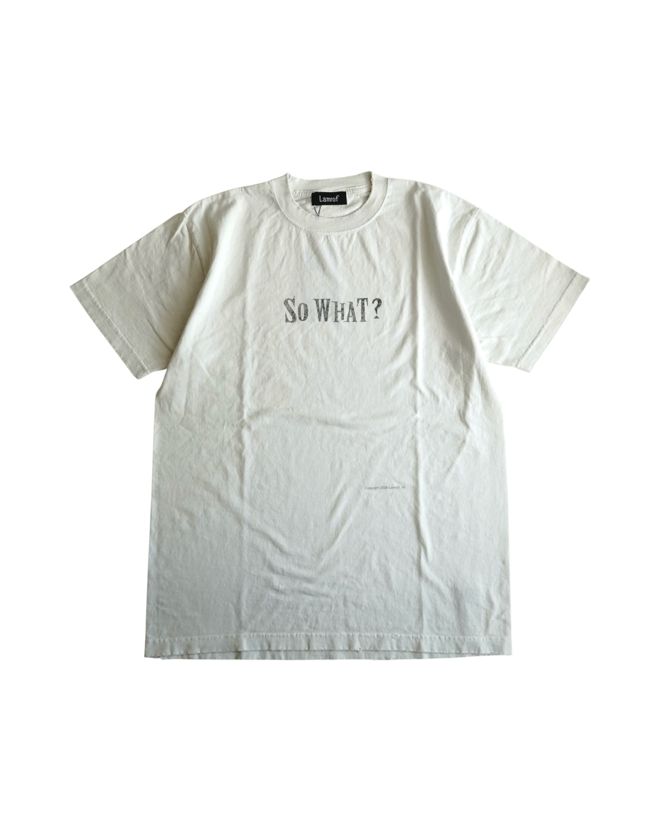 レジェンドトランペッター「マイルスデイビス」の口癖であった So What –だから何- に「?」を加え問いかけ式の表現として新たにメッセージ化して製作したオリジナルグラフィック。音楽性やリズムを感じるような手書き文字で表現することで言語としての強さを緩和した仕上がり。 私自身もすごく大好きな言葉で、当時マイルスが音楽の方向性や、ジャズ表現の新たな時代を切り開く中でメディアに様々な質疑が投げかけられた際に「だから何?」とよく用い一刀両断していた彼を表わす合言葉。続けて彼は「ジャンルやカテゴリは関係ない、全て“音楽“という一つのジャンルだ」と常々語っていたことも印象的。最高にCOOL。定番のTシャツは経年変化を感じられる様なダメージ加工、バイオウォッシュ加工、柔軟加工を施し、フェード感の出るオリジナルカラーに染め仕上げたオリジナルボディを制作。