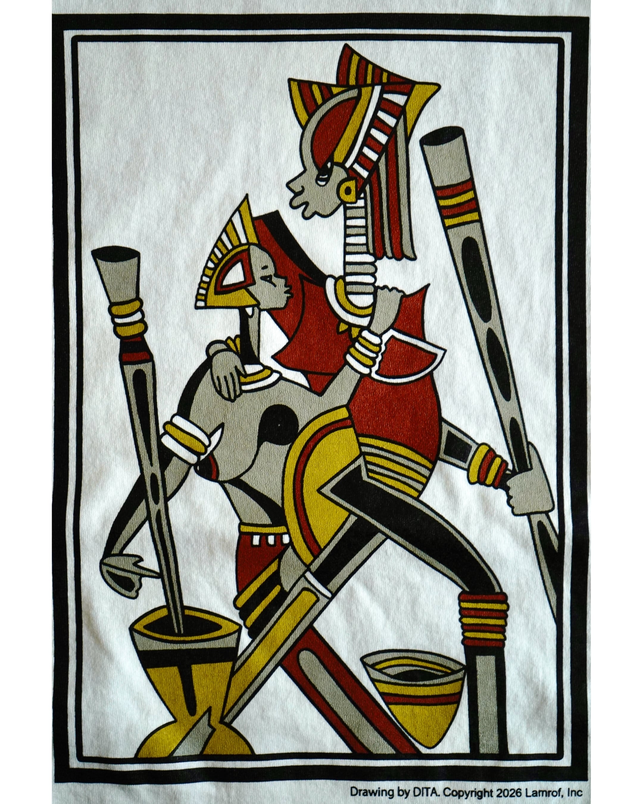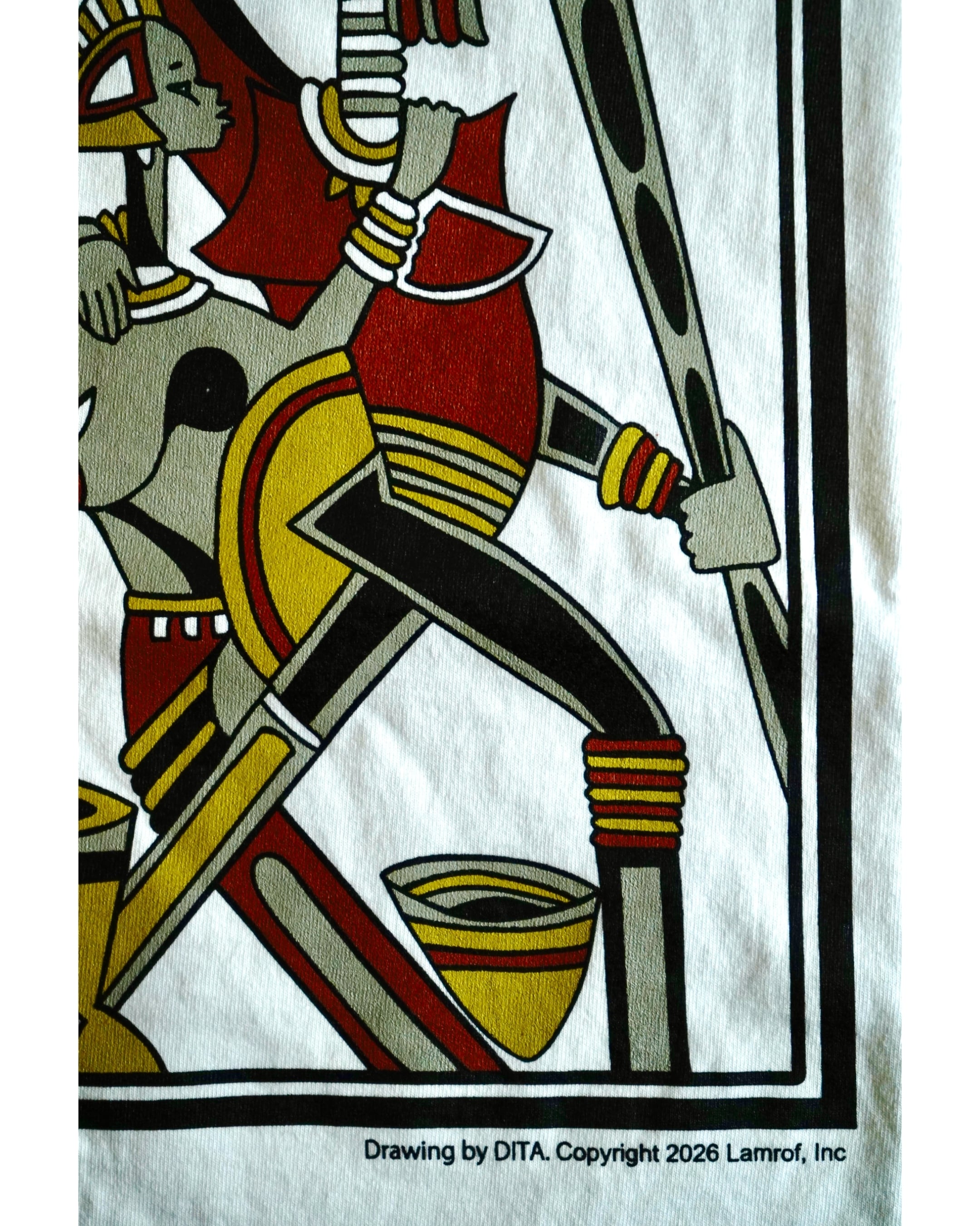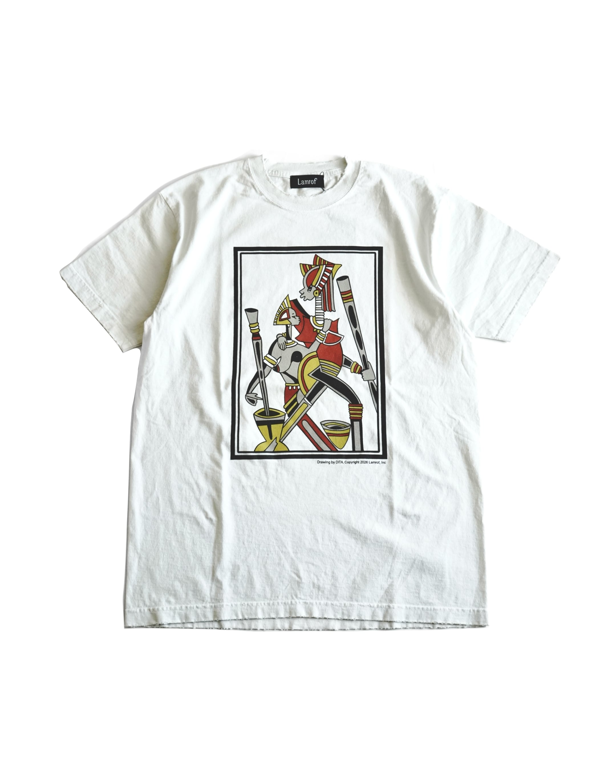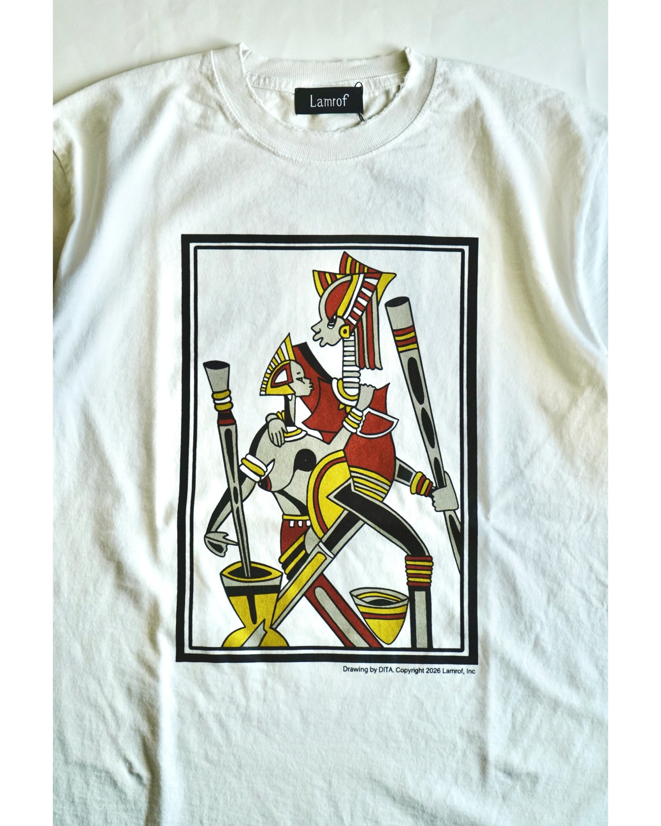 デザイナー坂本氏が旅の途中に西アフリカ、セネガルの街SALYで出会ったサンドアートのアーティストDITAの美しい色彩感覚から繰り広げられる作品の数々に衝撃を受け始まった友好関係から製作したオリジナルのコラボレーションアートグラフィック。DITAのアトリエ訪問やコミュニケーションを重ね、彼の承諾のもとコラボレーションとしてLamrofで彼の作品を特別にグラフィックとして落とし込んで作成。大枠のテーマのみを決めて後は頭の中に湧き出てくるデザインで制作を行うDITAの手法から生まれた本作は「アフリカの親子」がテーマ。定番のTシャツは経年変化を感じられる様なダメージ加工、バイオウォッシュ加工、柔軟加工を施し、フェード感の出るオリジナルカラーに染め仕上げたオリジナルボディを制作。