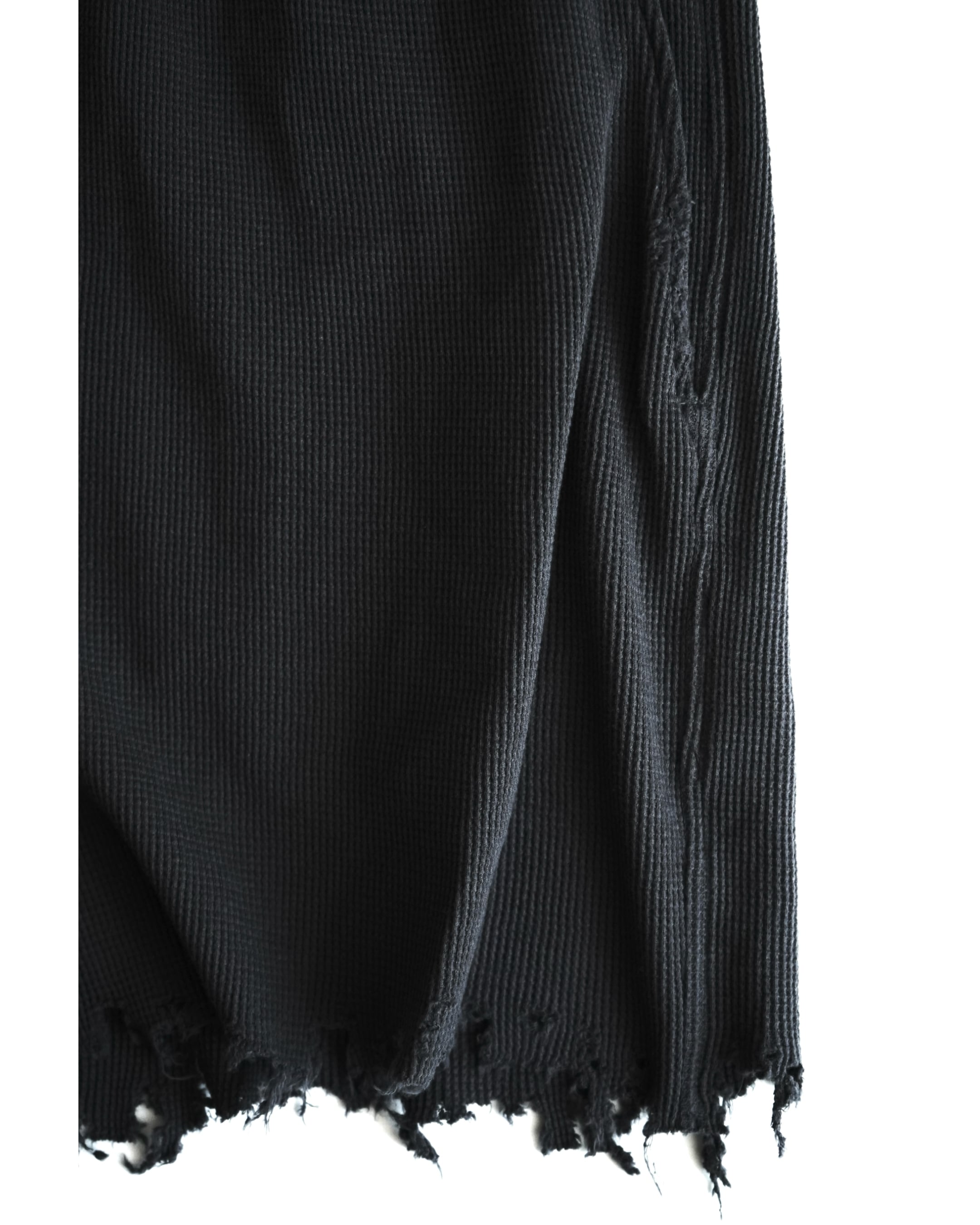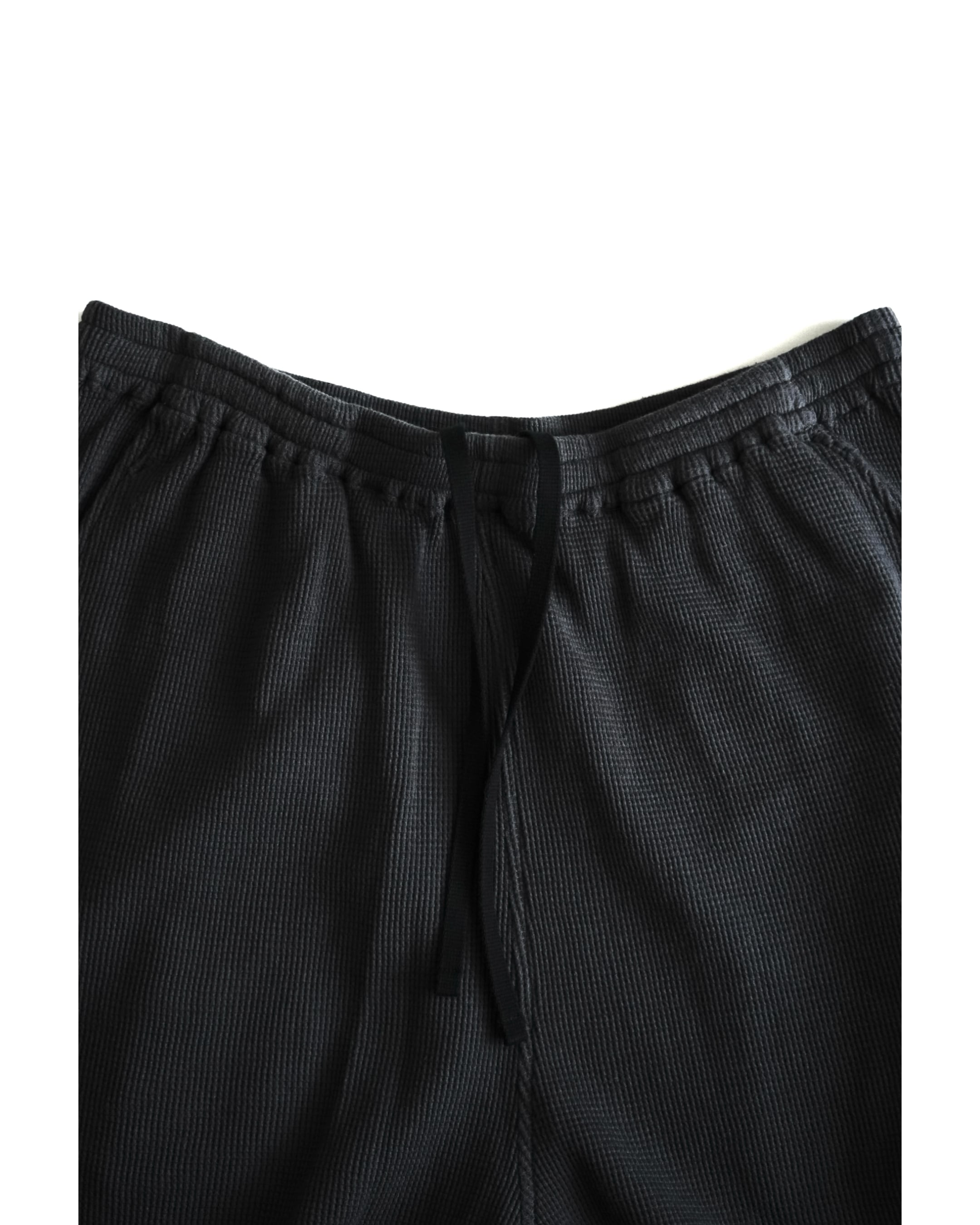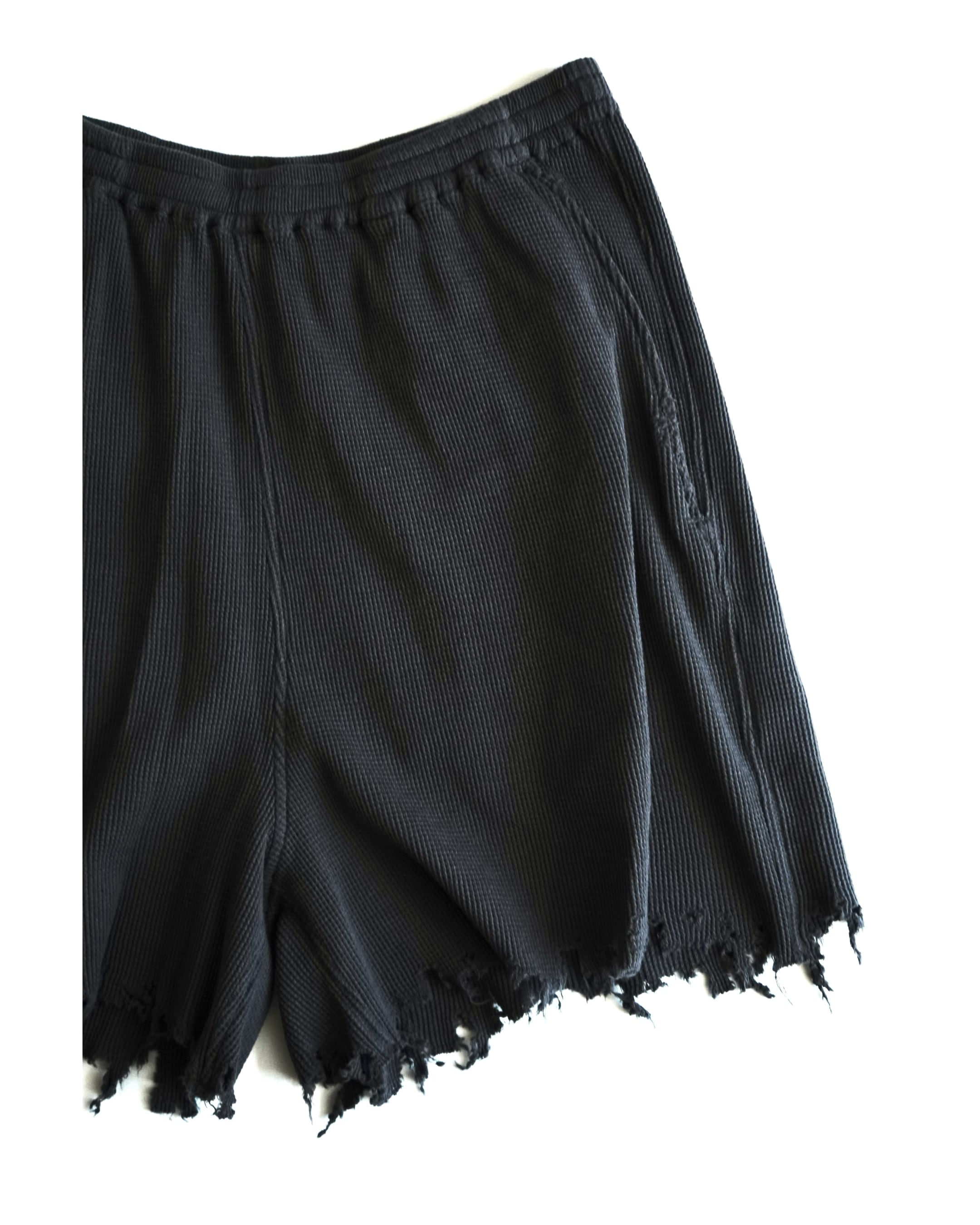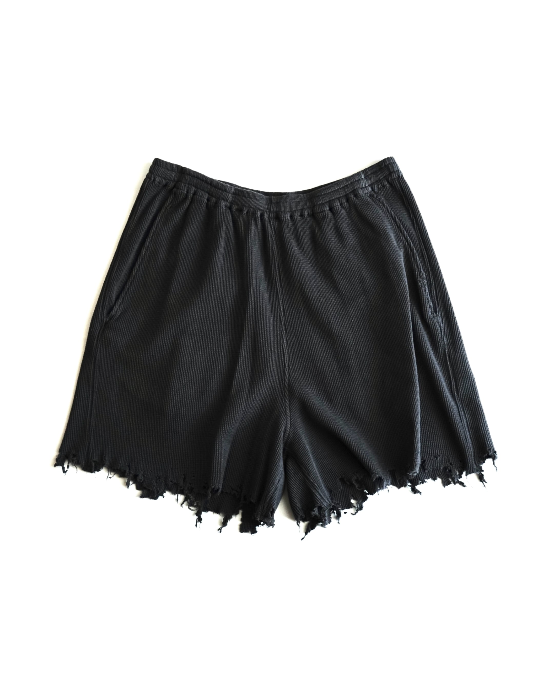 ショーツ。シグネチャーディテールでもある裾のグラインダーを用いた手作業のダメージ加工はポケットにも反映。ウエストはドローストリングス、サイドはスラッシュポケットを入れて仕上げた日常着としての実用性に配慮したディテールバランス。ゆったりとしたサイズ感ながら素材の柔らかさによってシャープなルックスでまとめたバランス。重さのないライトウェイトなコットンサーマルの素材特性を活かせるようバイオウォッシュ、柔軟加工で仕上げ。