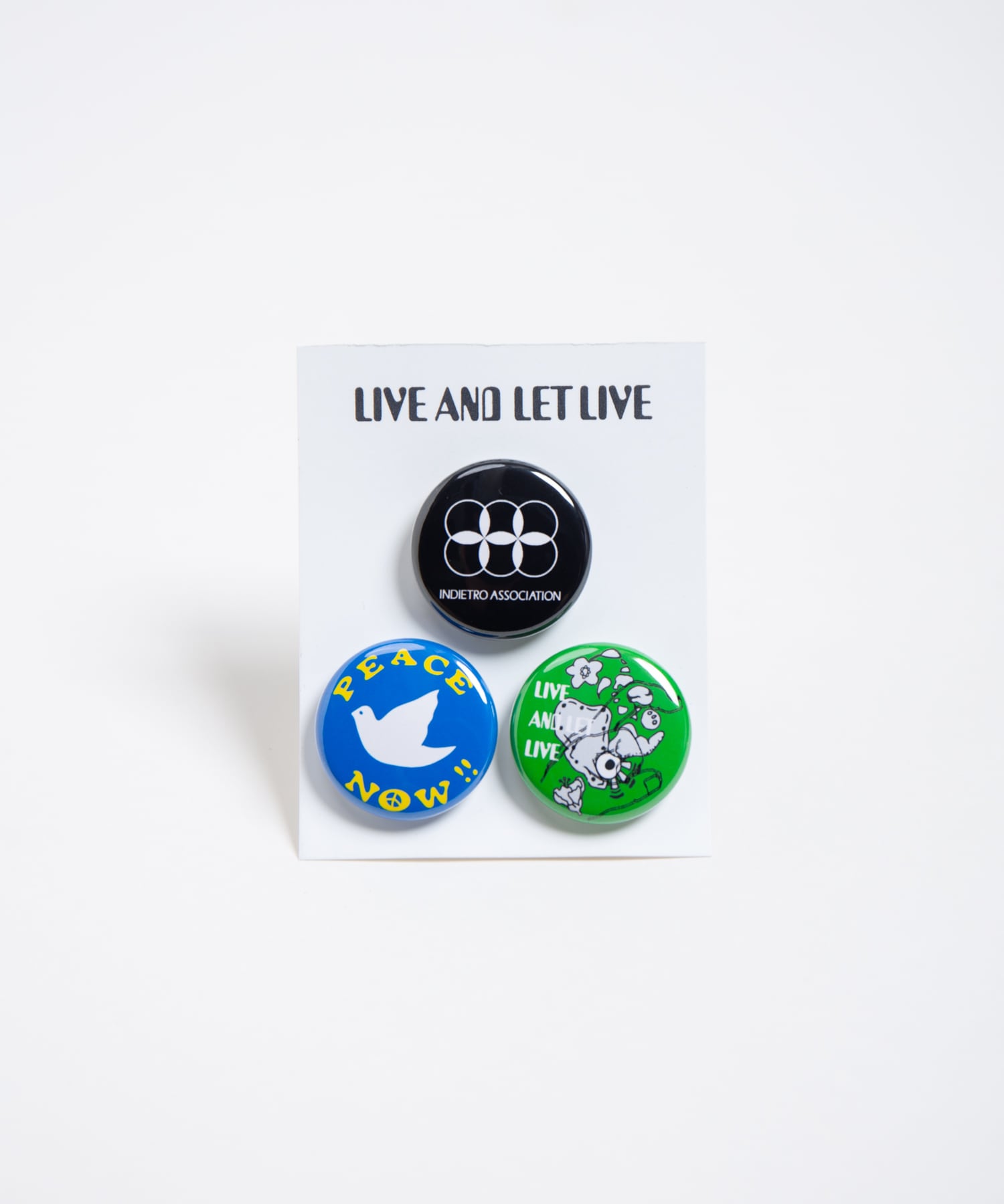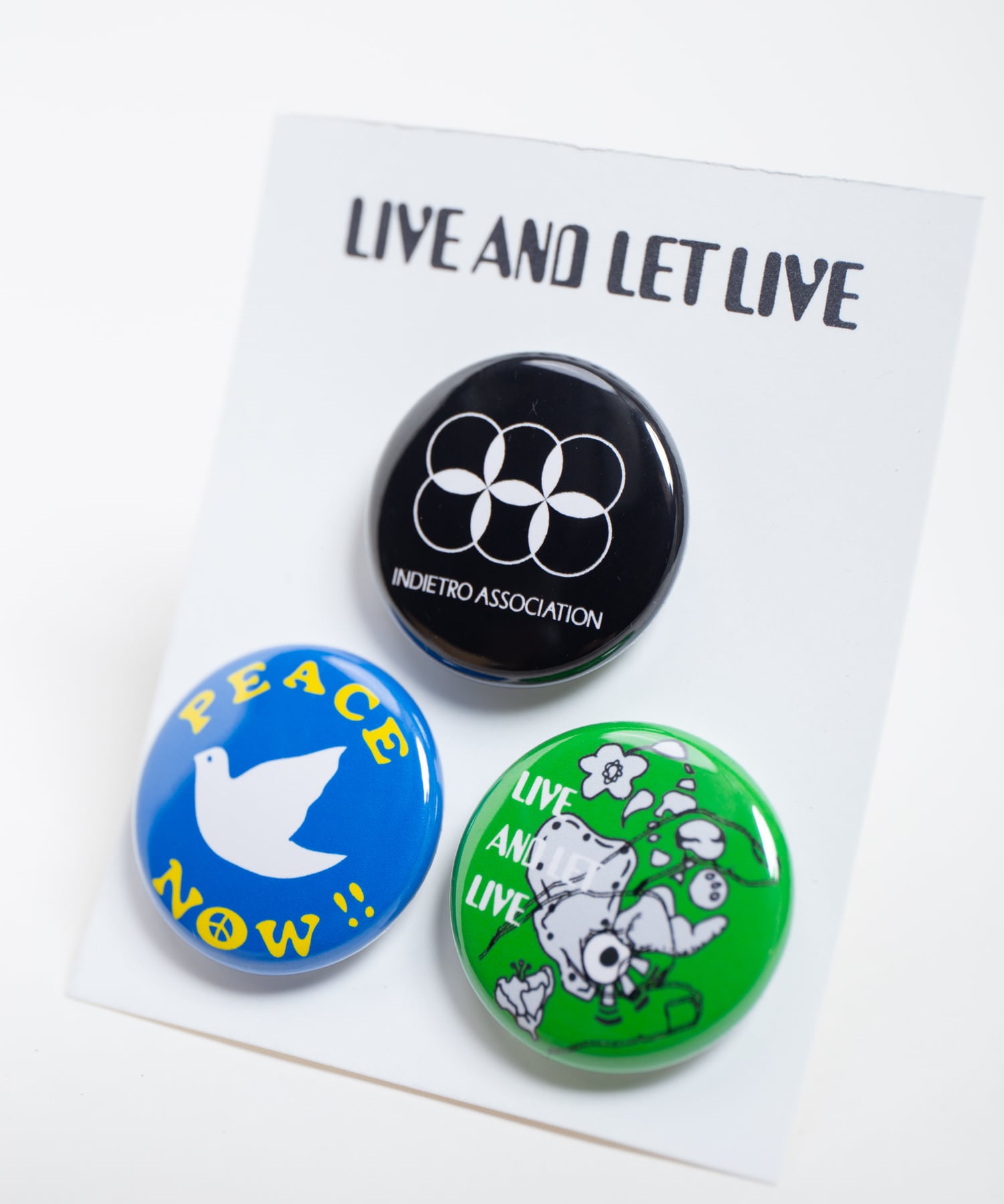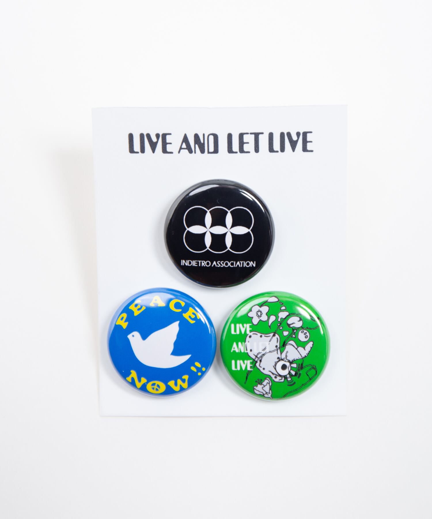 ブランドのロゴデザイン、平和の象徴である鳩デザイン、70年代のサイケデリックアートから着想を得たデザインの3種類セットの缶バッチです。