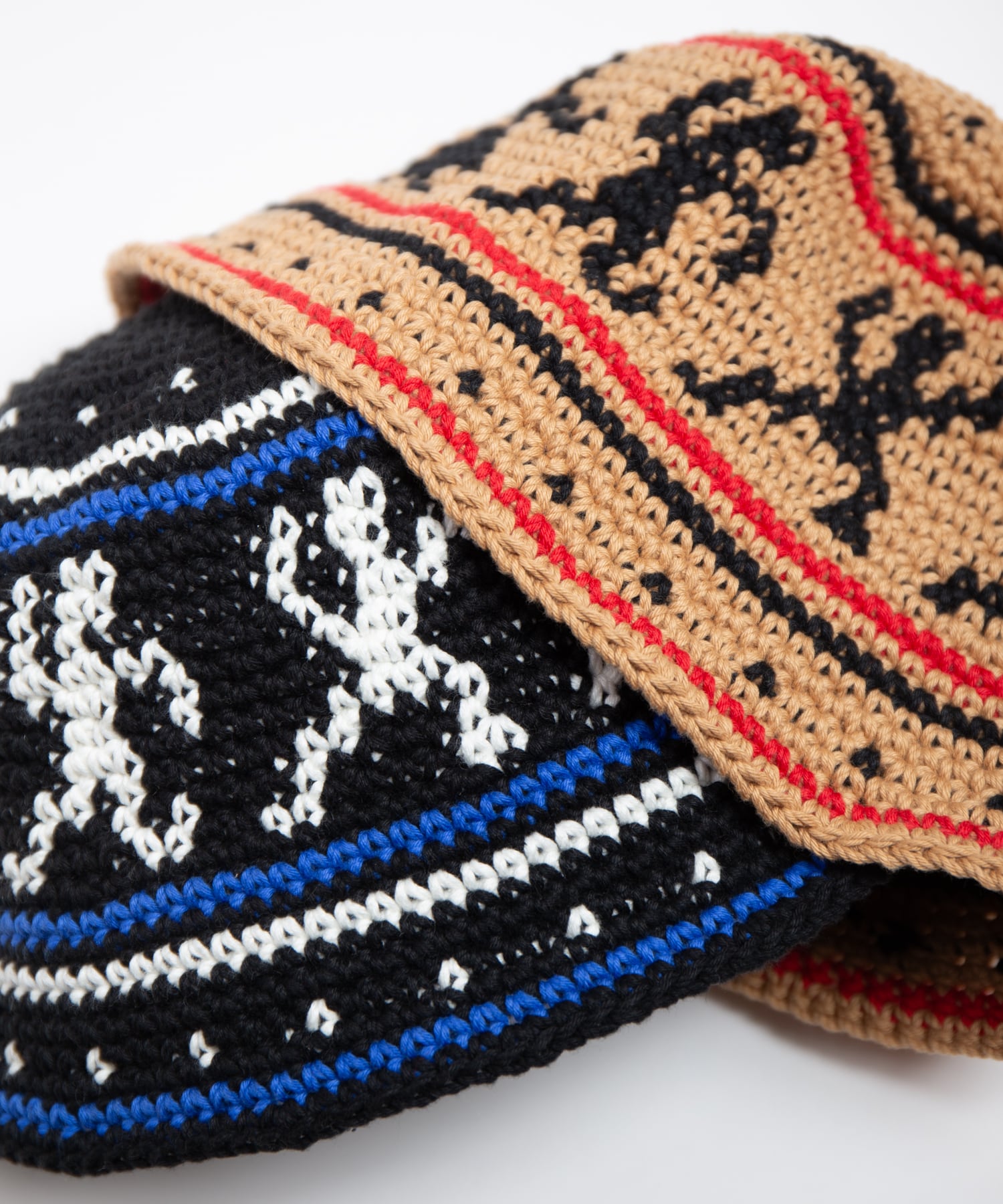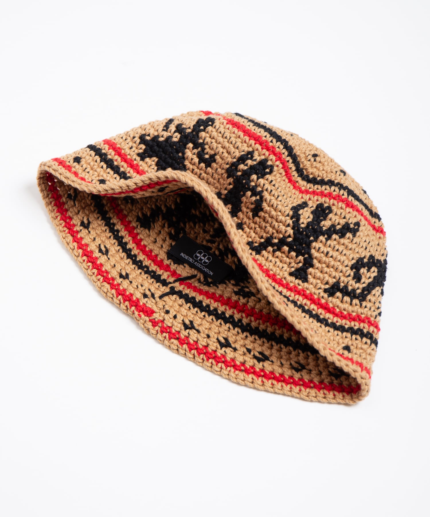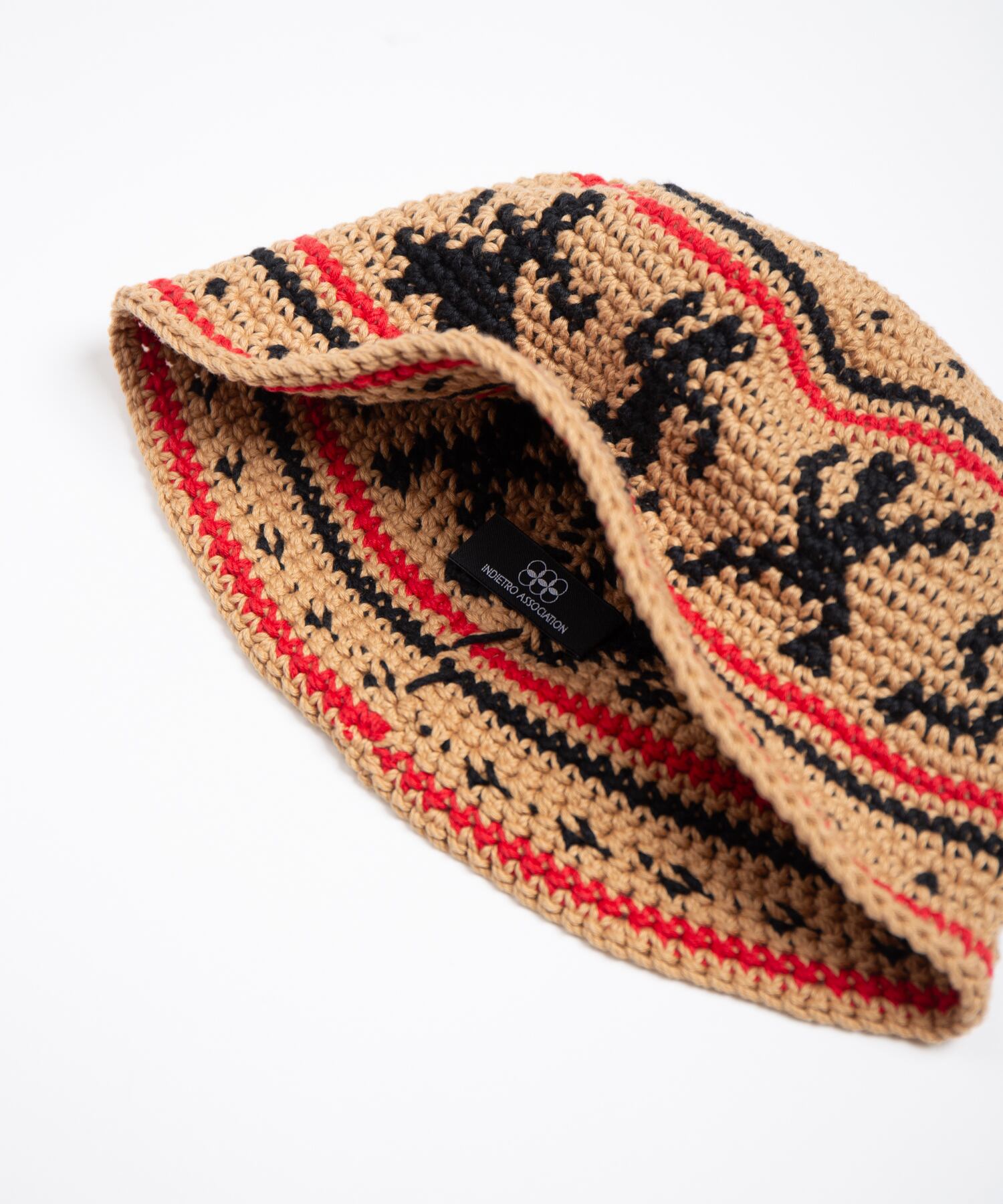 ハンドニットで編み立てたニットハットです。60年代カウンターカルチャーを象徴とするウッドストックをイメージしたデザインが特徴になっています。糸はコットン糸を使用している為、シーズン問わずご使用頂けます。着用をしていくうちに頭にフィットをしていくよう少しきつめのサイズ感になっています。中性洗剤を使用してぬるま湯で手洗いすることが可能です。