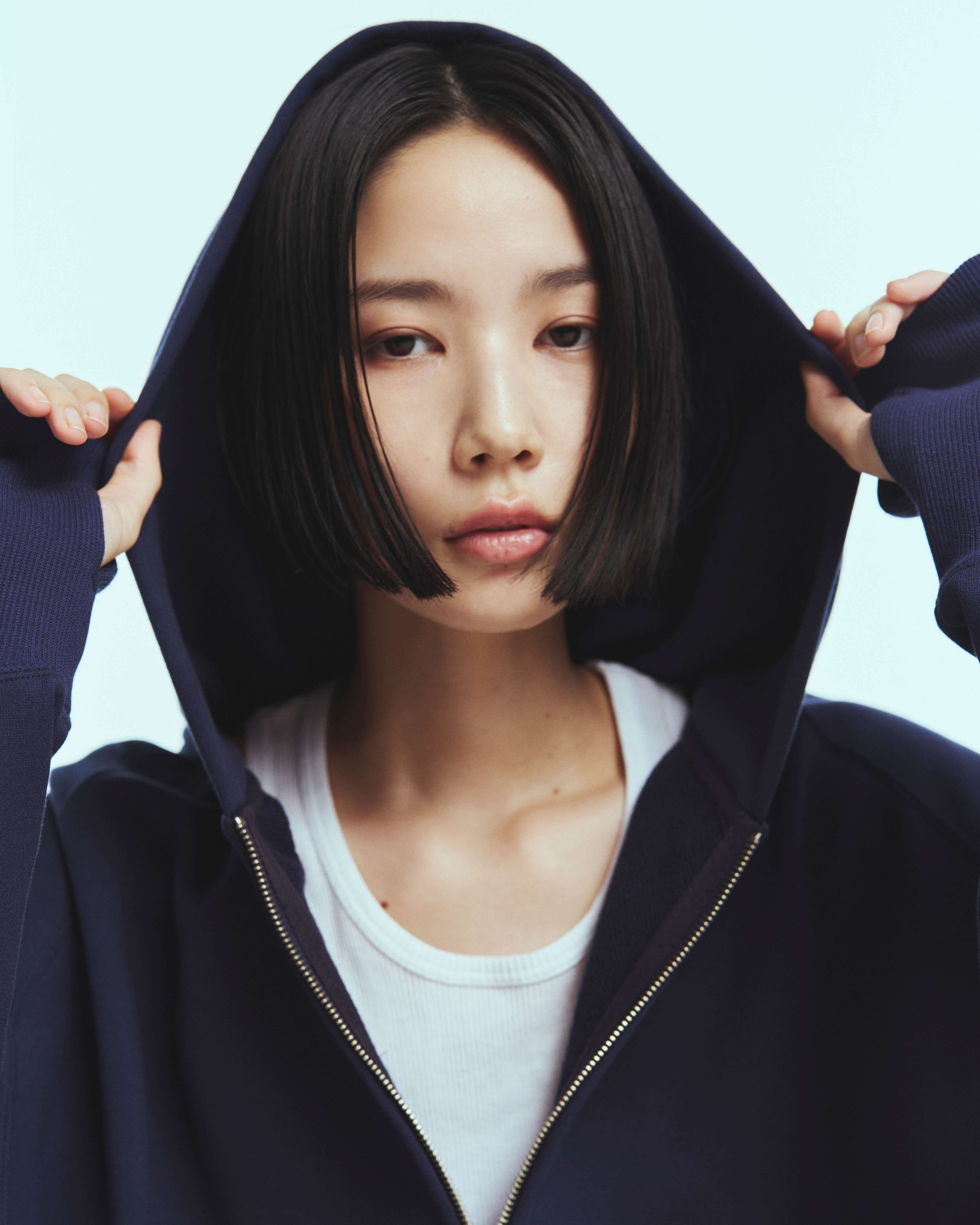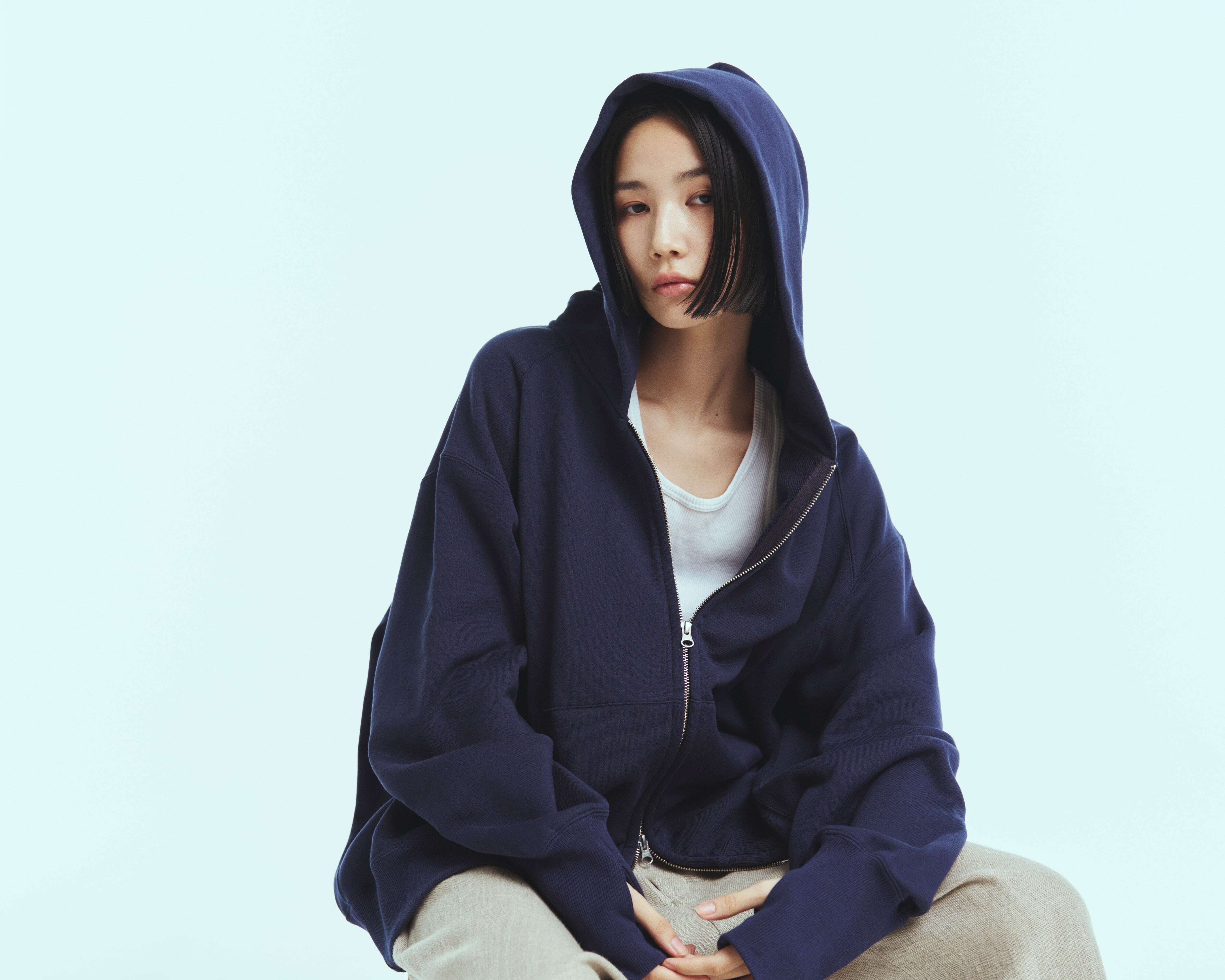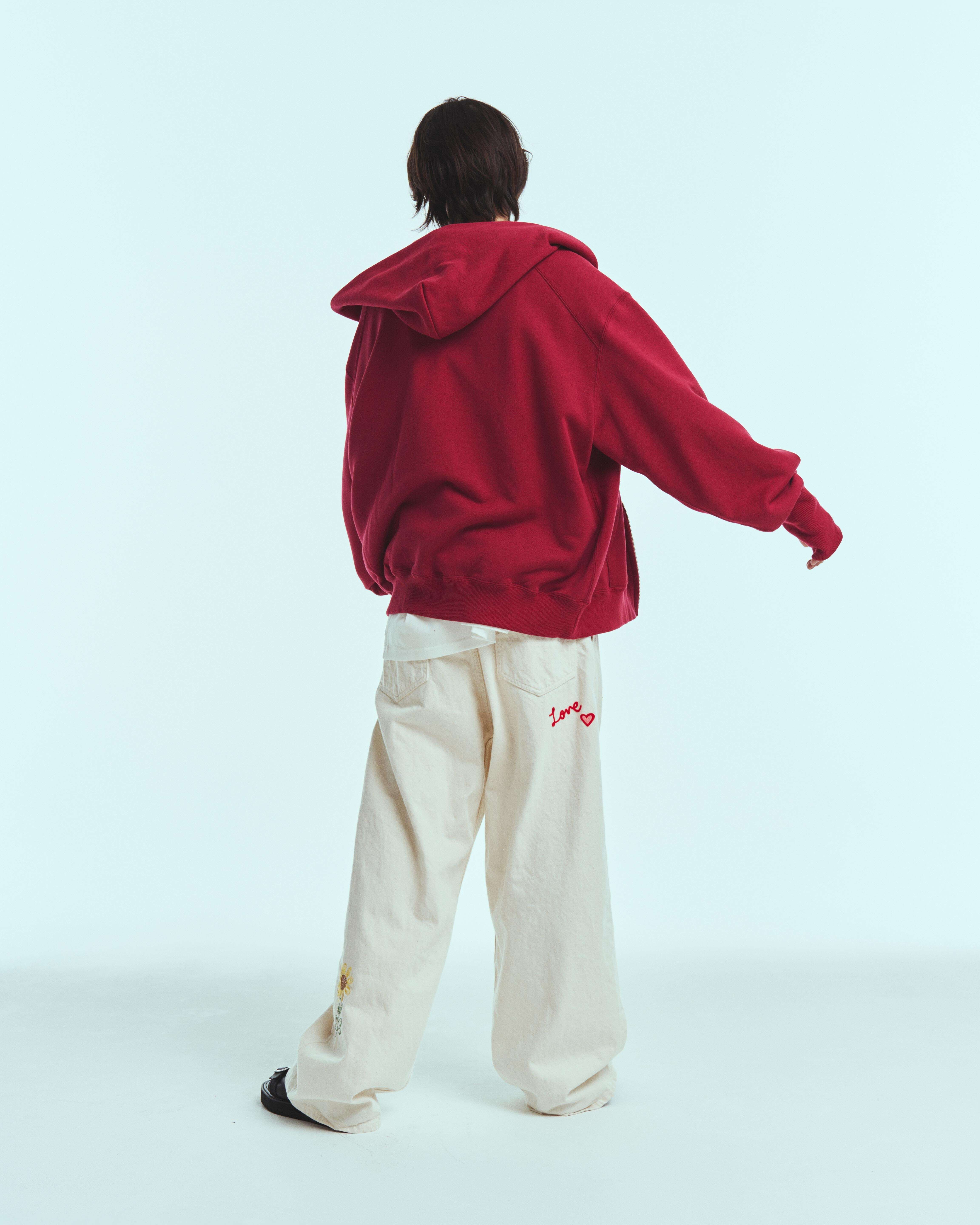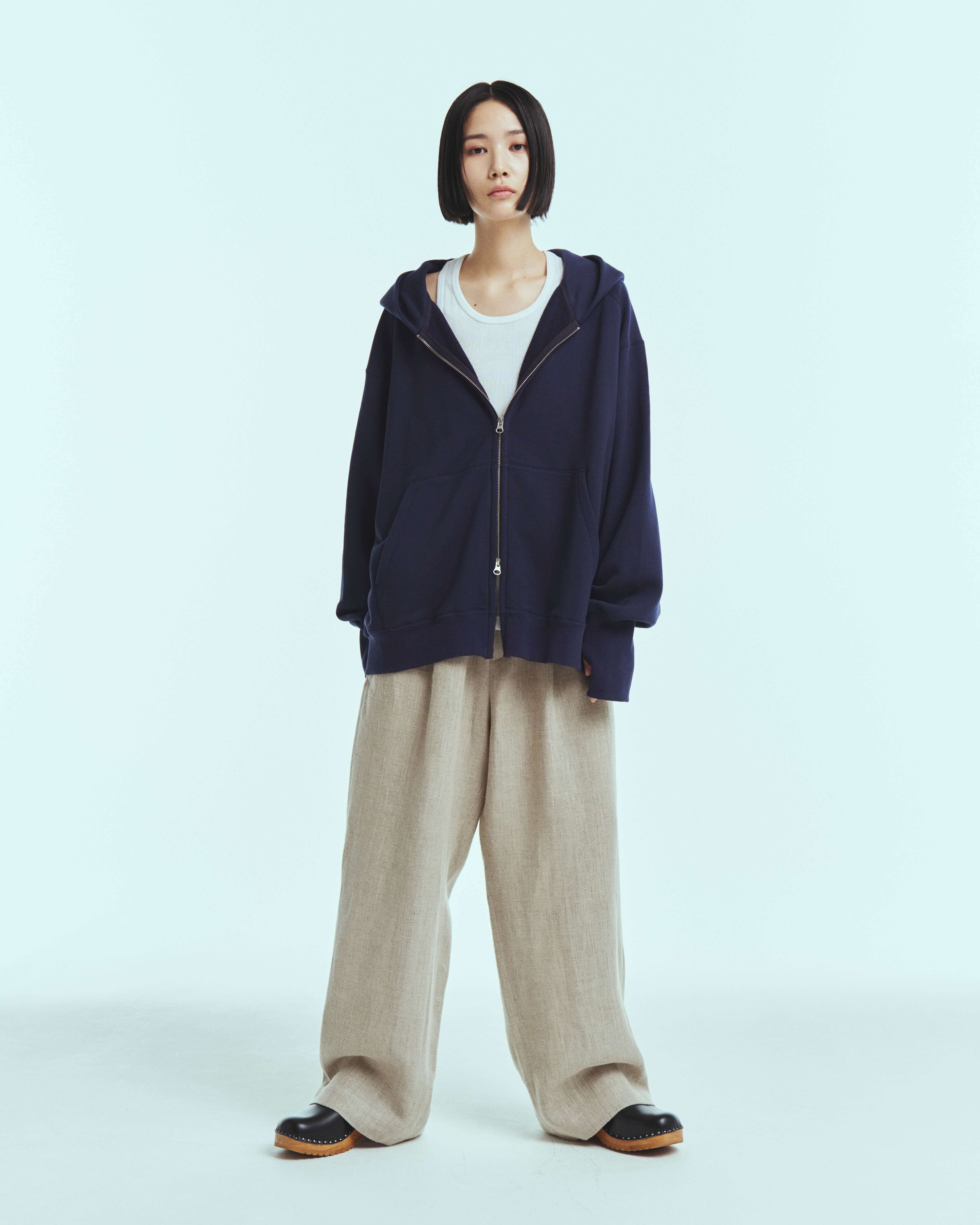春の着用に適した強撚タイプの薄めのスウェット素材を使用したジップアップフーディーになります。