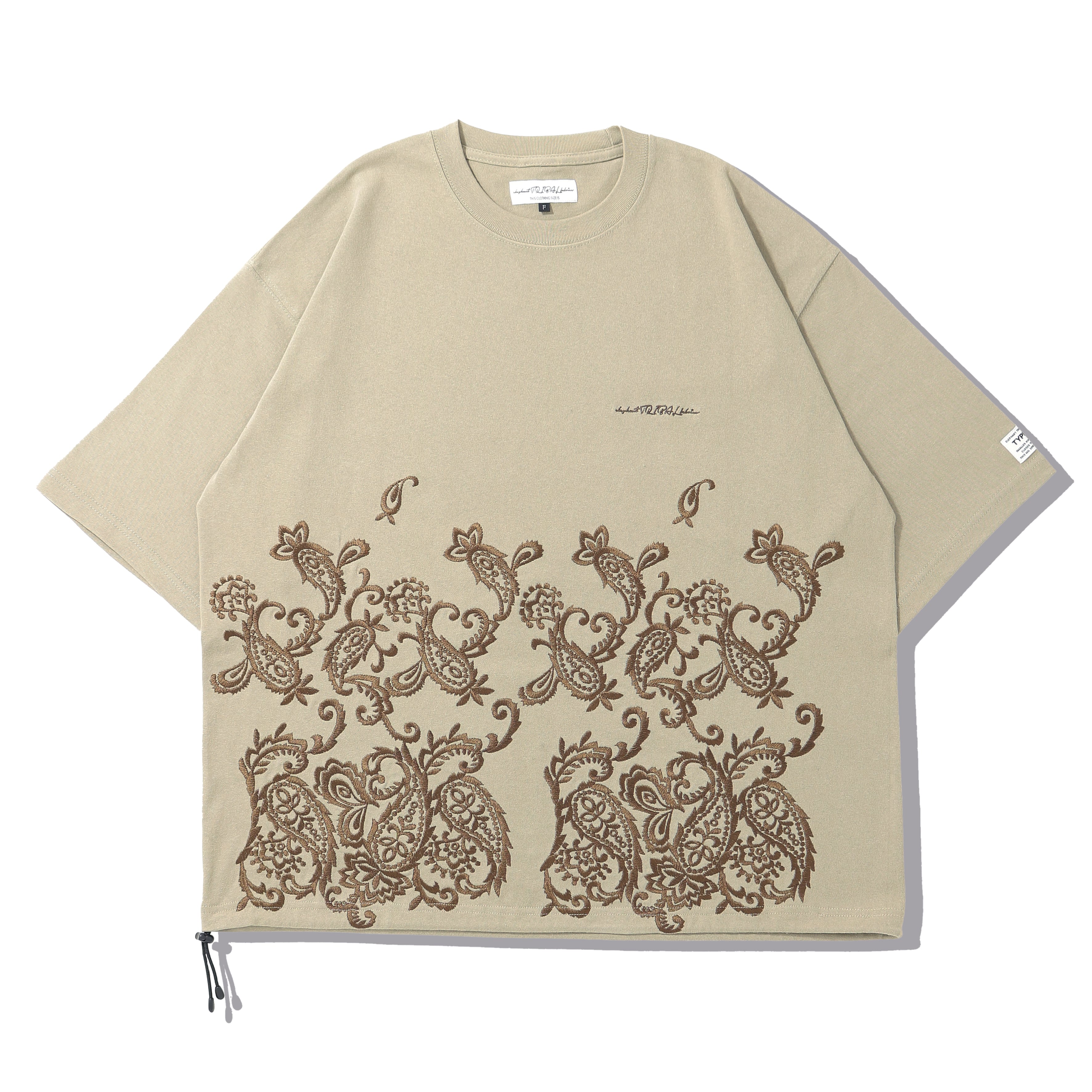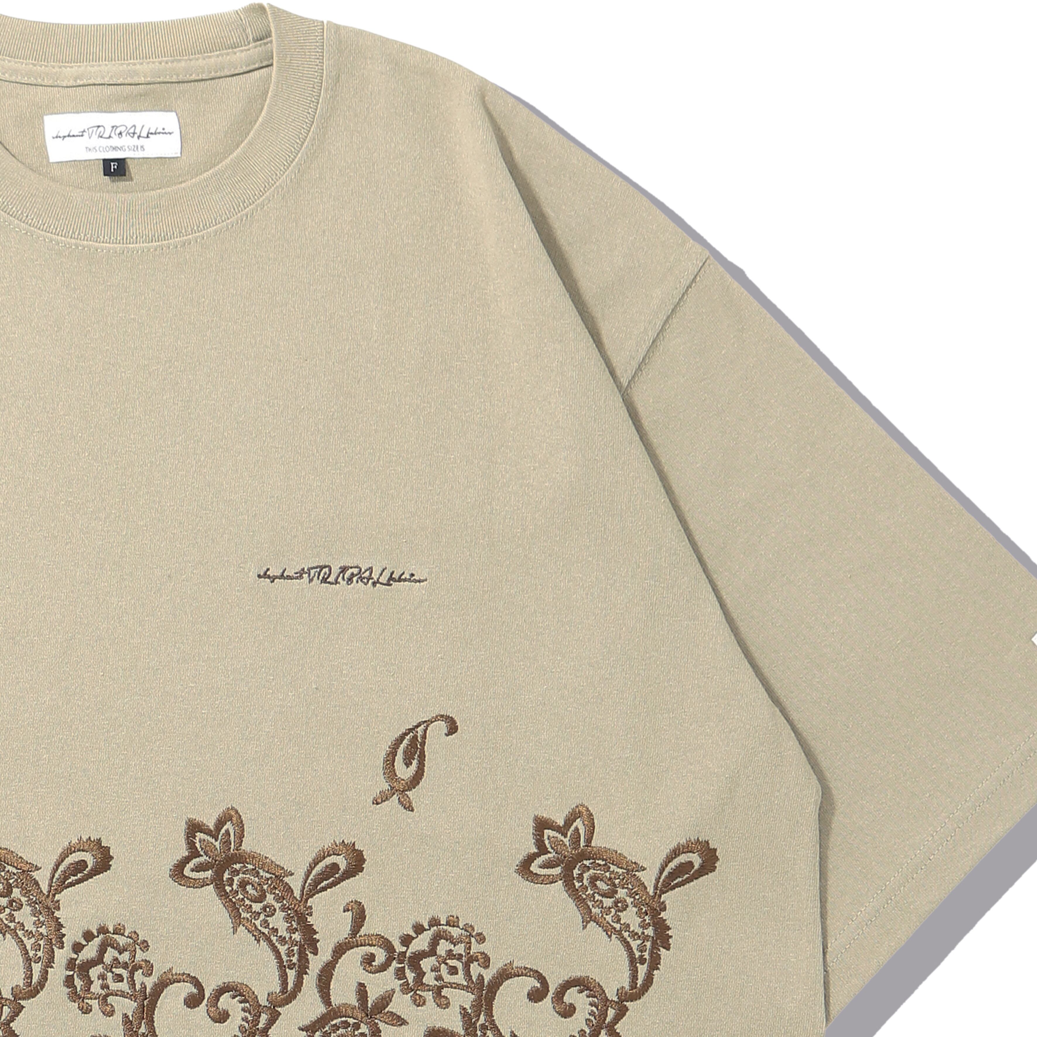 定番で展開しているFAT T-SHをベースにフロント中央から裾にかけてペイズリー刺繡を施したアイテム。胸部分にブランドロゴ刺繍を配置。身幅にゆとりを持たせたボックスシルエット。素材には強撚糸を使用した、シャリ感のあるヘビーオンスコットン天竺を使用。裾部分にはアジャスター付きドローコードを配置し、シルエット変更が可能。