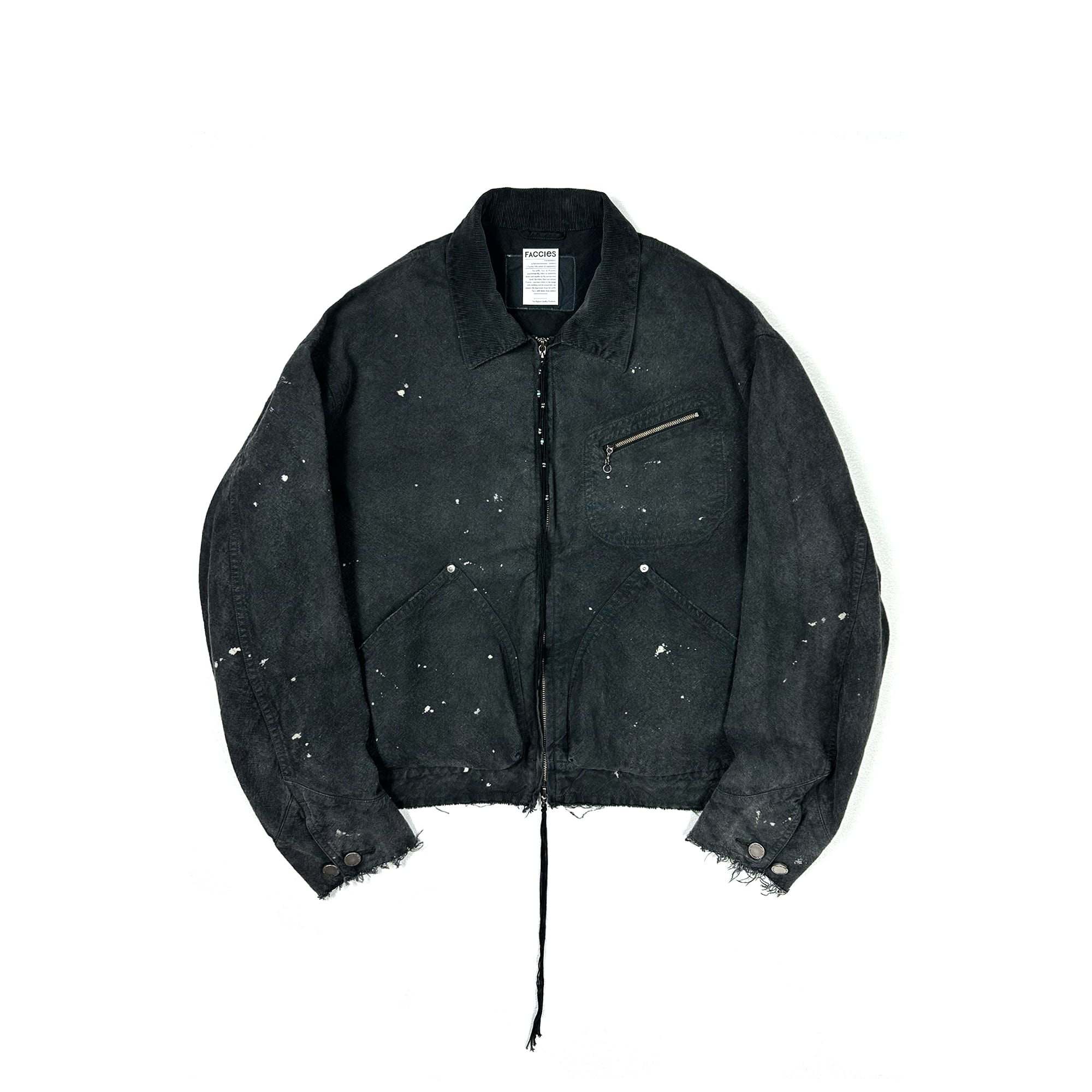 Zipジャケット。斜めに入る胸ポケットジッパーや腰部分のマチ付きのポケットのディティール、コール衿の色褪せ感が魅力的なアイテムに仕上げました。フロントはダブルジップで引き手の紐を長めに設定しており数箇所にビーズがアクセントとしてあしらわれている。