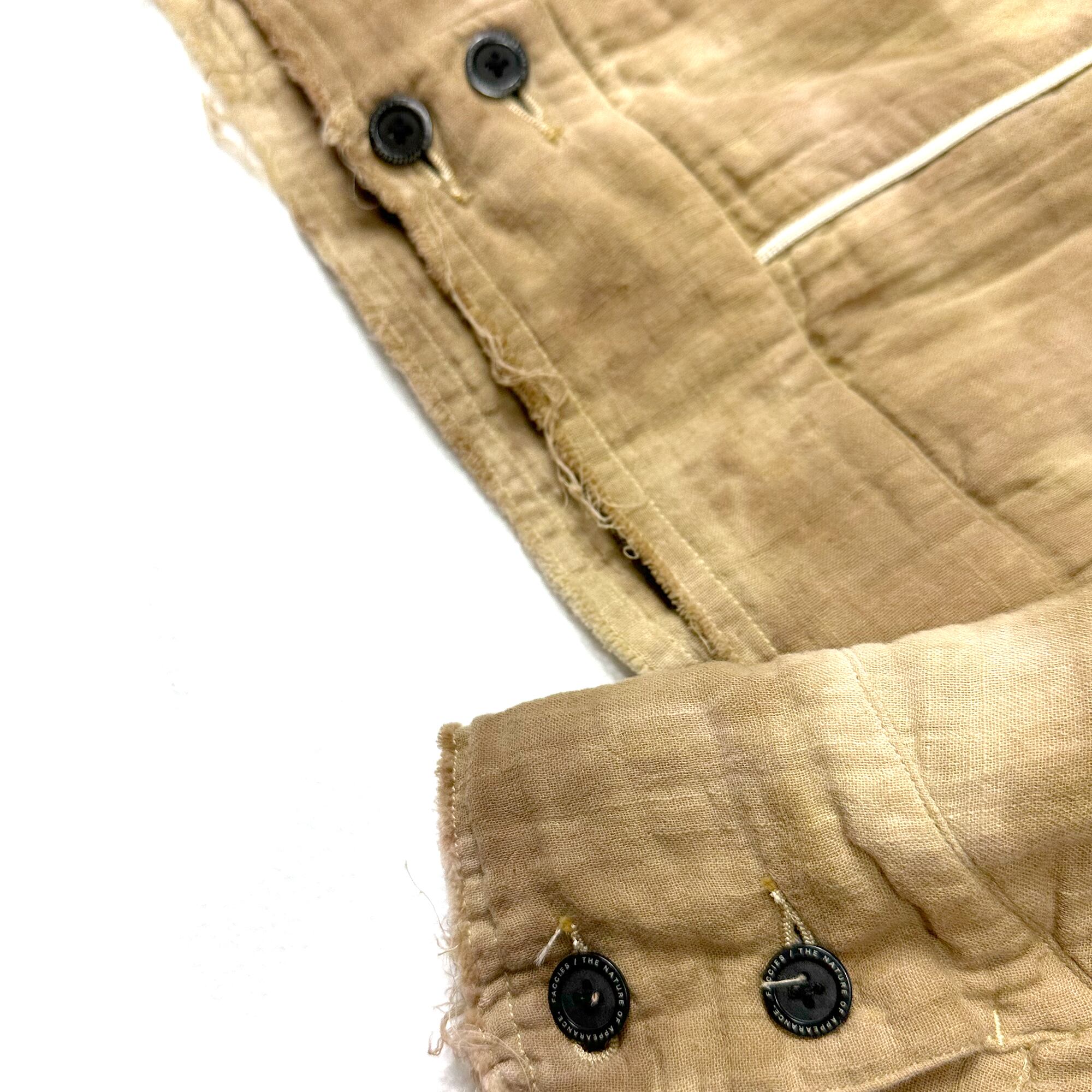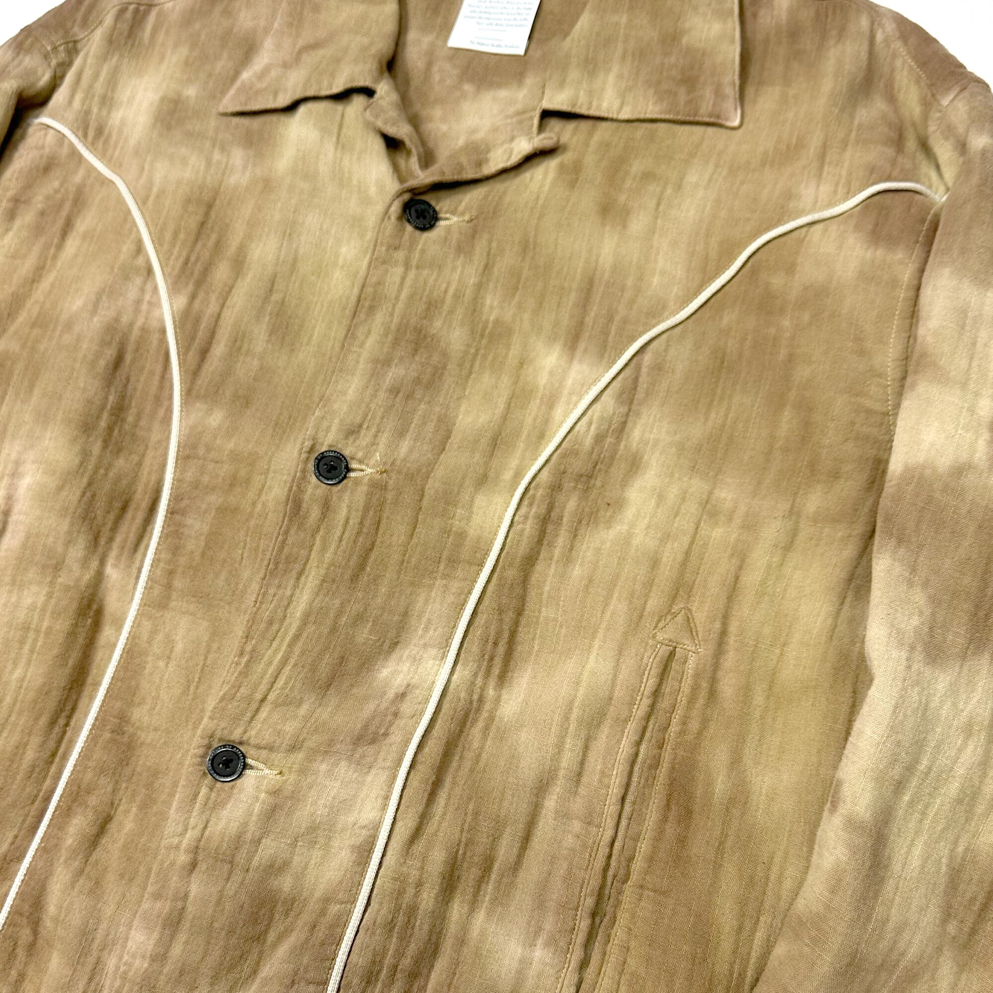 素材には縦横に40番のコットンスラブ糸を使用し、フラットになりすぎないよう二重織でふくらとした風合いに落とし込んだダブルクロスガーゼを使用。裏地にも同素材を仕様しておりよりふっくらとした着用感が特徴。シルエットはフロントとバックにパイピングがあしらわれているウエスタンブルゾンタイプ。着丈はショート気味で身幅はワイドなシルエット。